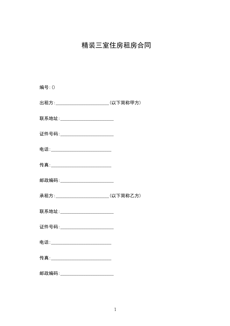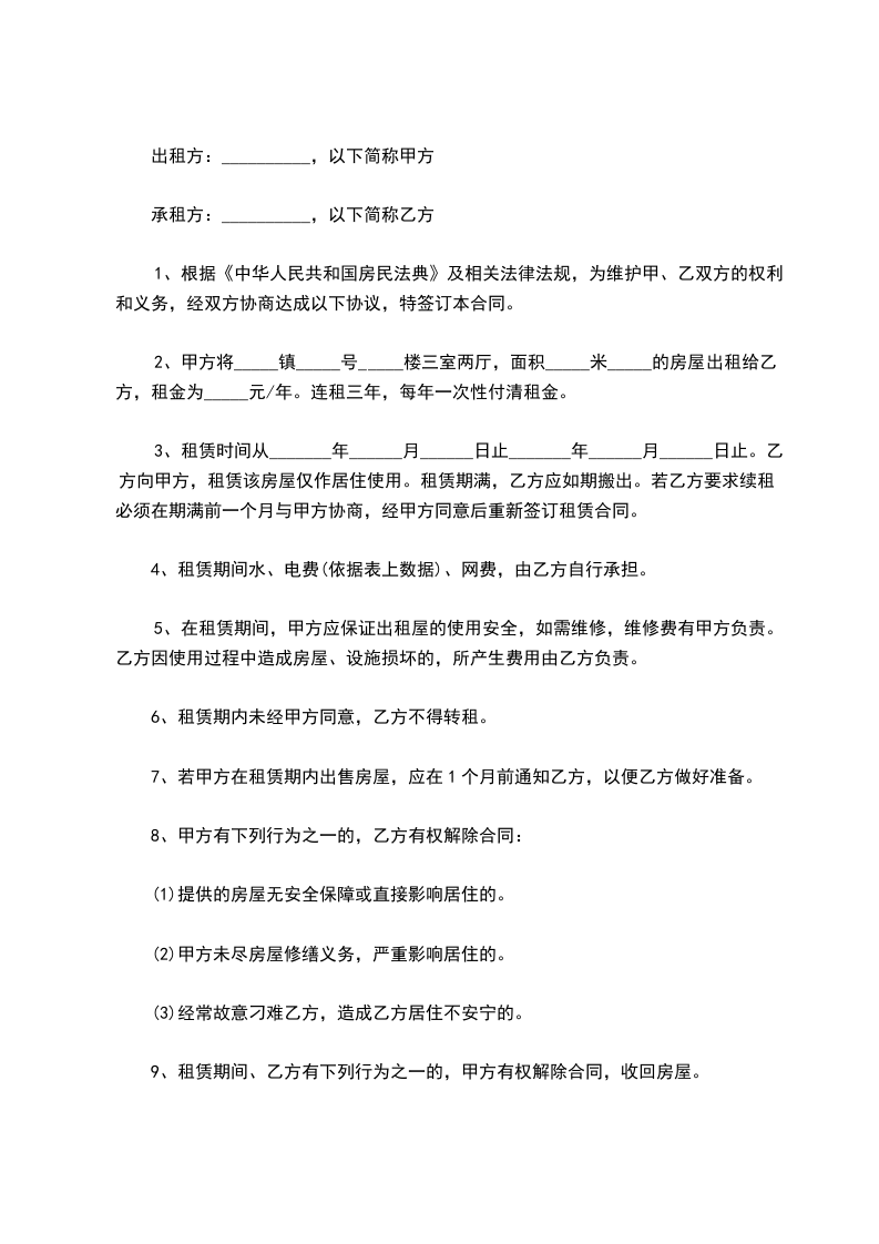 2、甲方将_____镇_____号_____楼三室两厅,面积_____米_____的房屋出租给乙方,租金为_____元/年。连租三年,每年一次性付清租金。