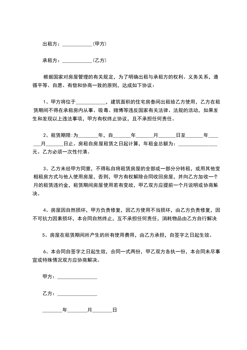 3、租赁时间从_______年______月______日止_______年______月______日止。乙方向甲方,租赁该房屋仅作居住使用。租赁期满,乙方应如期搬出。若乙方要求续租,必须在期满前一个月与甲方协商,经甲方同意后重新签订租赁合同。
