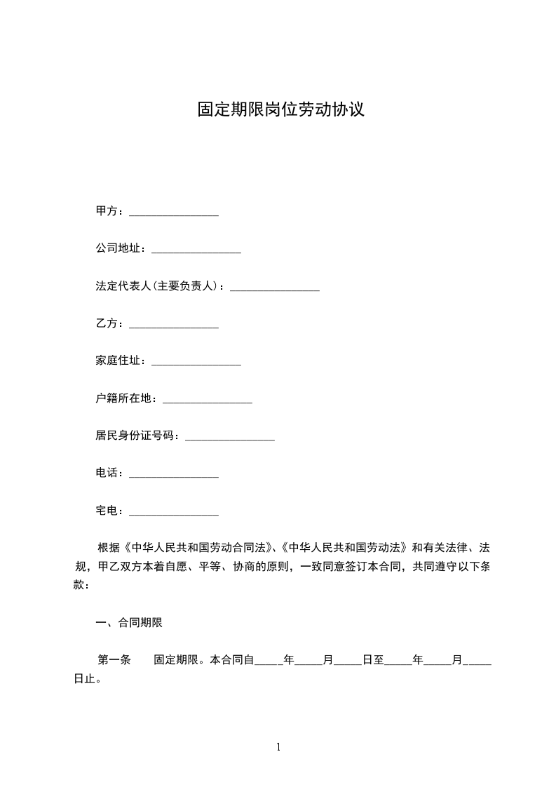 一、劳动合同期限:本合同为有限期劳动合同。本合同与_______年______月______日生效,其中试用期为一个月从_______年______月______日至_______年______月______日止。本合同于_______年______月______日终止。未履行合同,私自离开的,按自动离职处理,扣发一个月工资,不再聘用。
