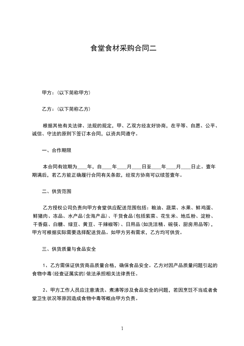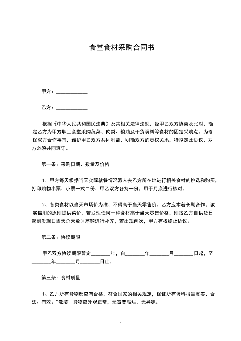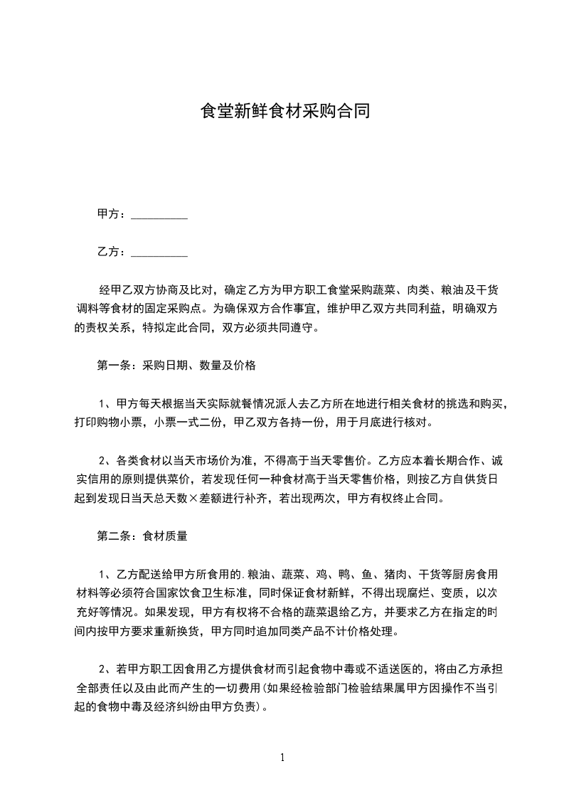 经甲乙双方协商及比对,确定乙方为甲方职工食堂采购蔬菜、肉类、粮油及干货调料等食材的固定采购点。为确保双方合作事宜,维护甲乙双方共同利益,明确双方的责权关系,特拟定此合同,双方必须共同遵守。