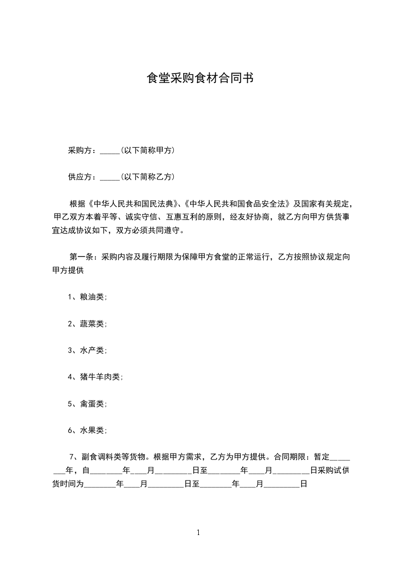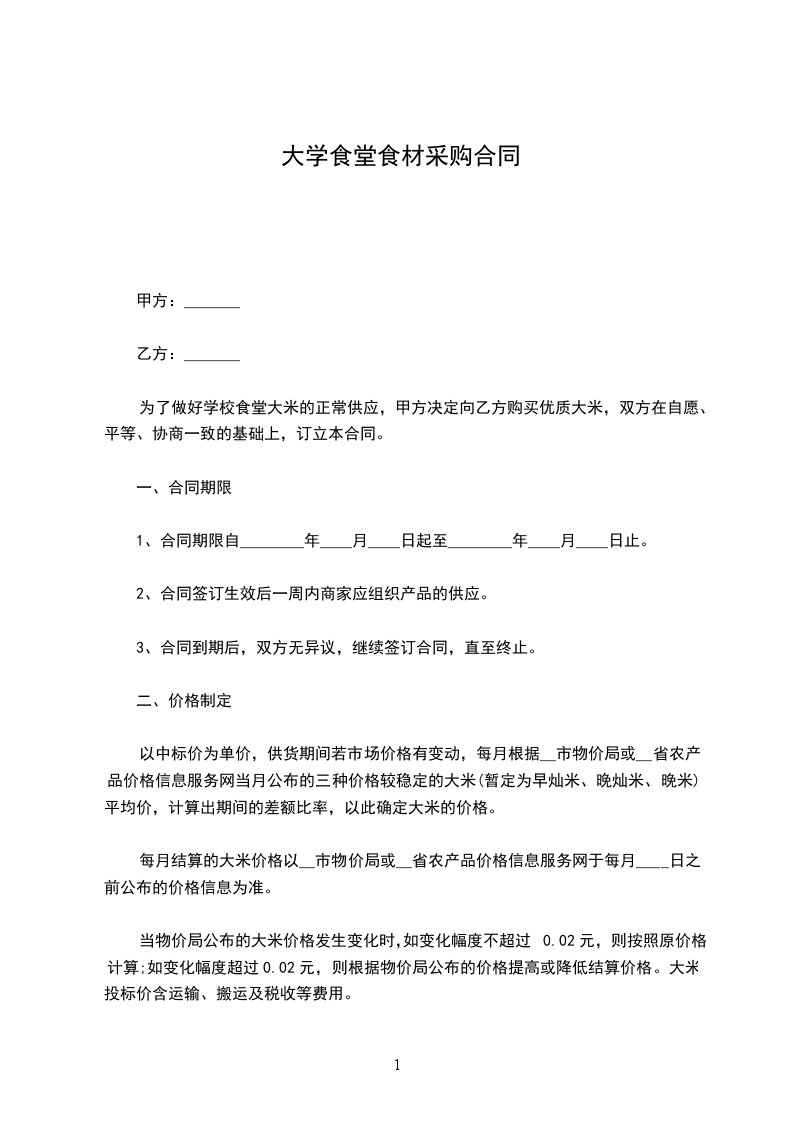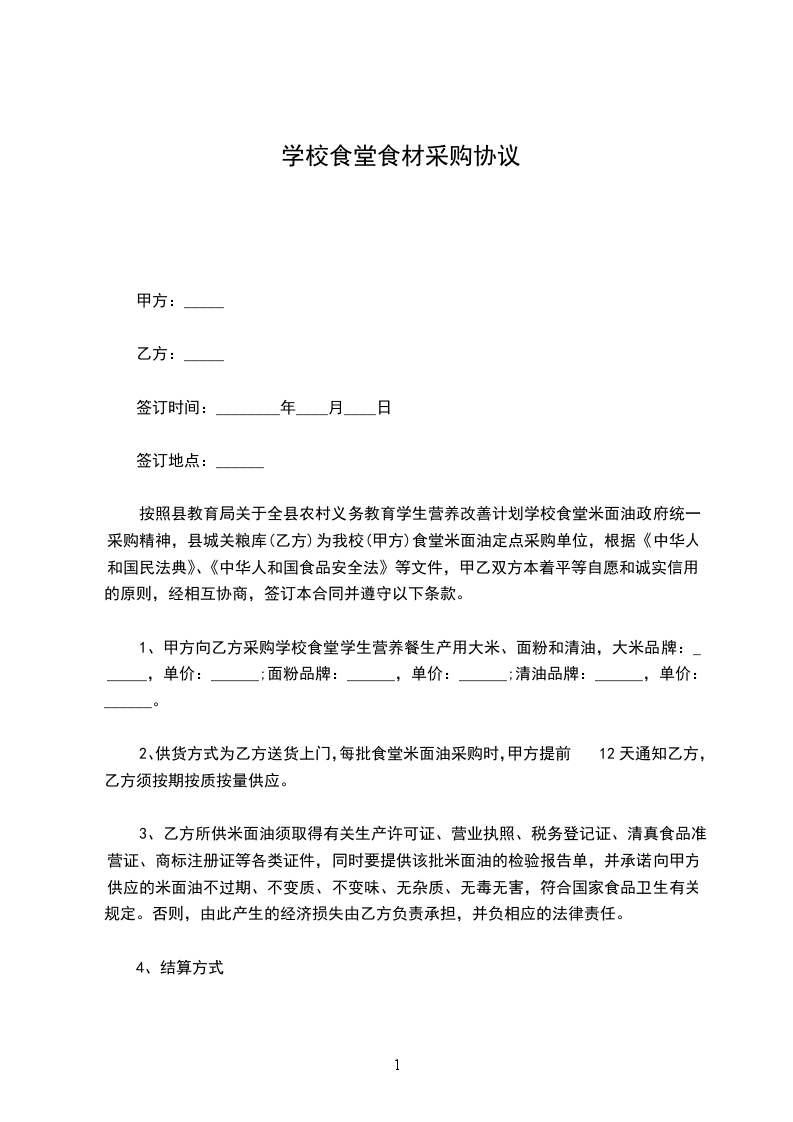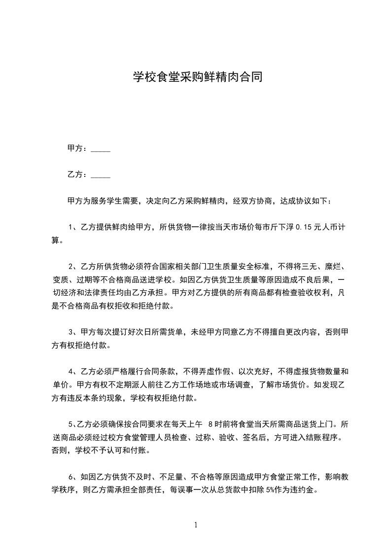 经甲乙双方协商及比对,确定乙方为甲方职工食堂采购蔬菜、肉类、粮油及干货调料等食材的固定采购点。为确保双方合作事宜,维护甲乙双方共同利益,明确双方的责权关系,特拟定此合同,双方必须共同遵守。
