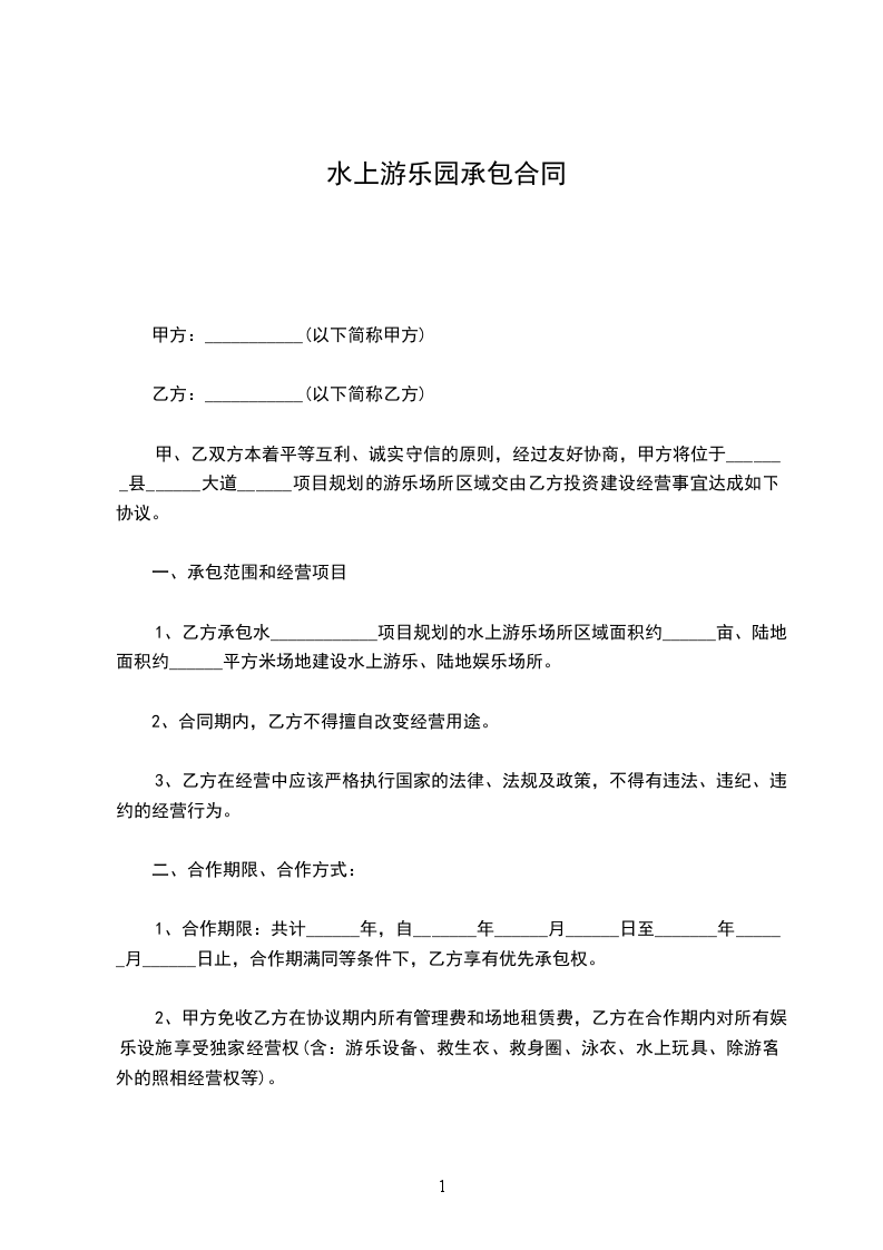1、乙方承包水____________项目规划的水上游乐场所区域面积约______亩、陆地面积约______平方米场地建设水上游乐、陆地娱乐场所。