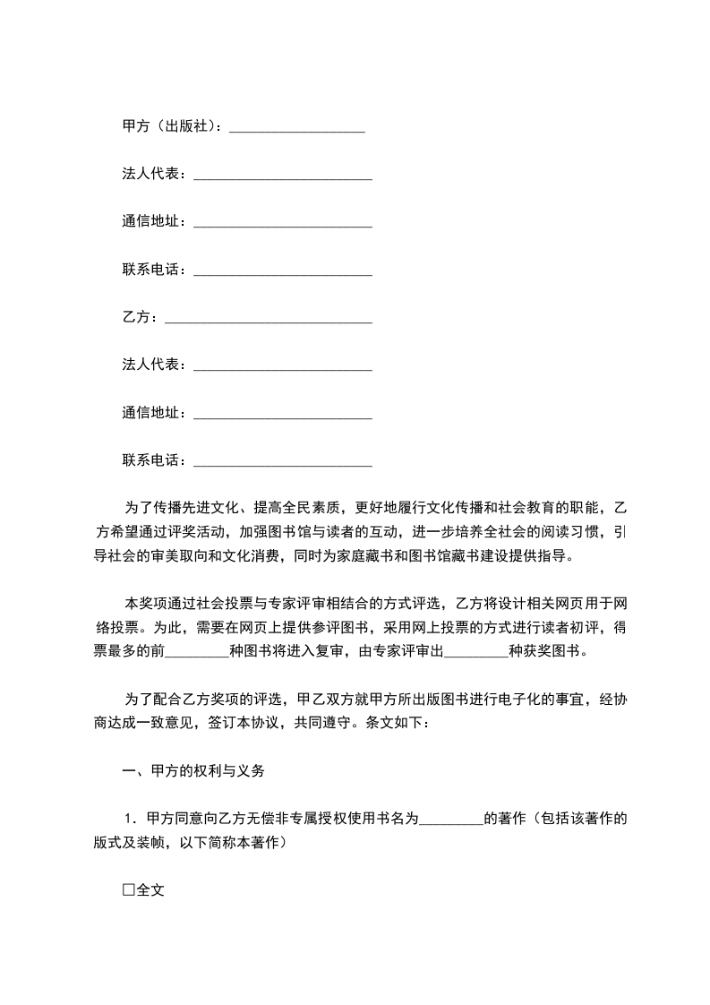 为了配合乙方奖项的评选,甲乙双方就甲方所出版图书进行电子化的事宜,经协商达成一致意见,签订本协议,共同遵守。条文如下: