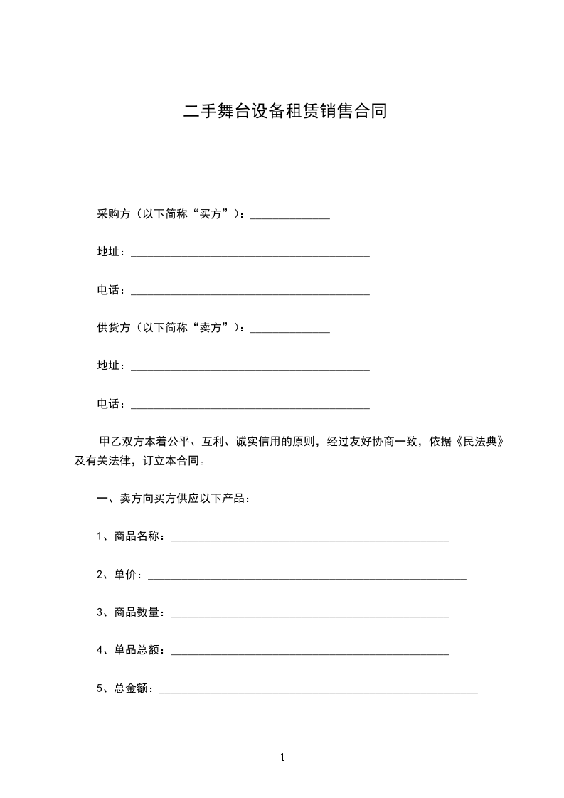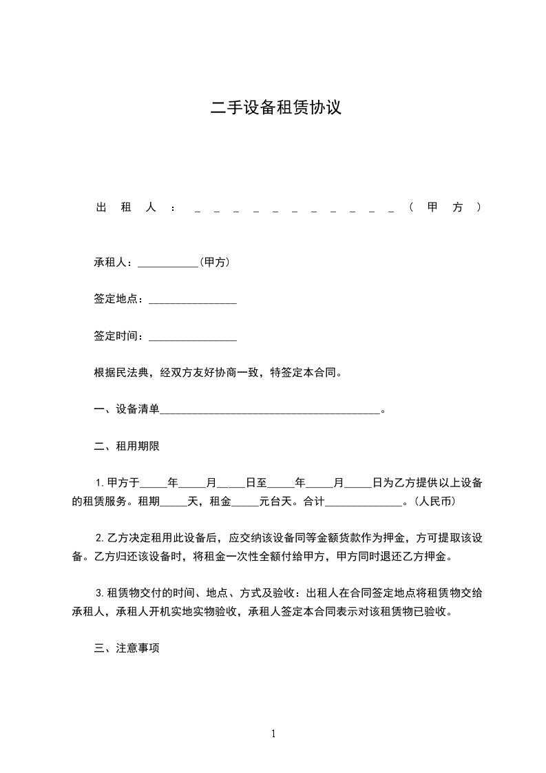 1.甲方于_____年_____月_____日至_____年_____月_____日为乙方提供以上设备的租赁服务。租期_____天,租金_____元台天。合计______________。(人民币)