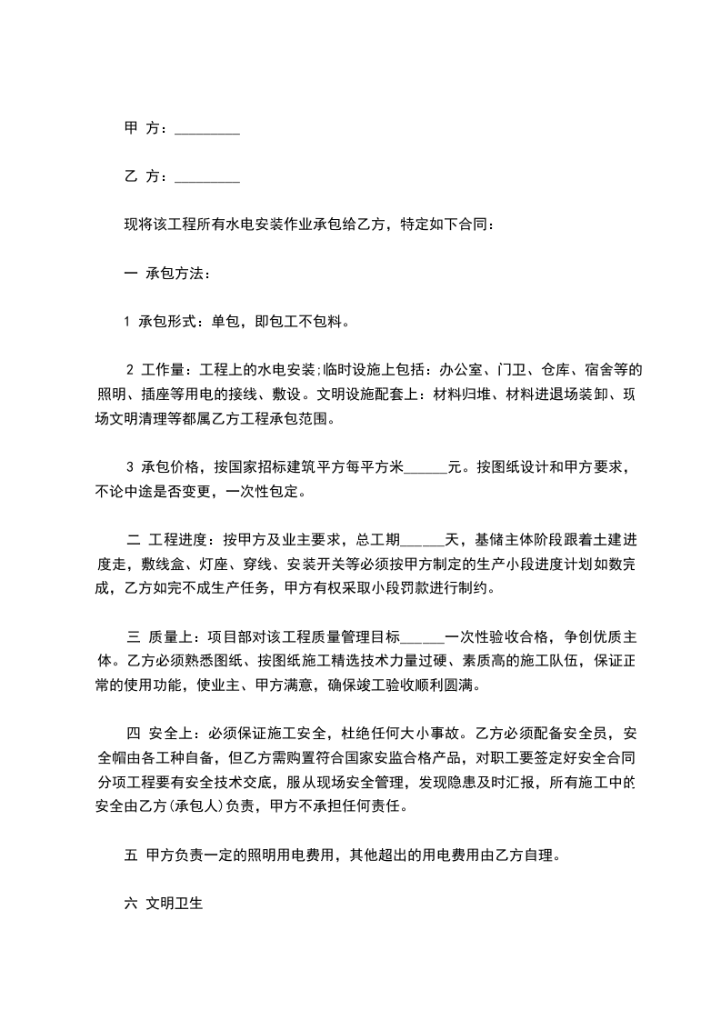 现将该工程所有水电安装作业承包给乙方,特定如下合同: