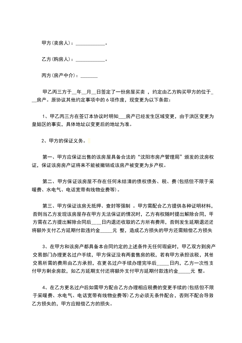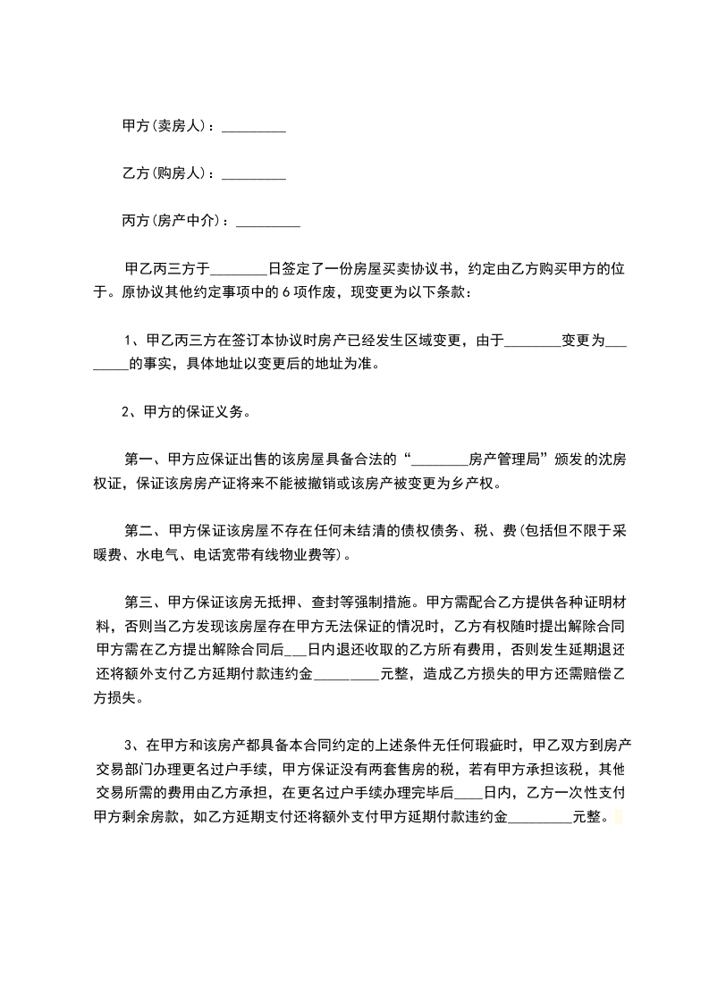 甲乙丙三方于_________日签定了一份房屋买卖协议书,约定由乙方购买甲方的位于_________房产。原协议其他约定事项中的6项作废,现变更为以下条款: