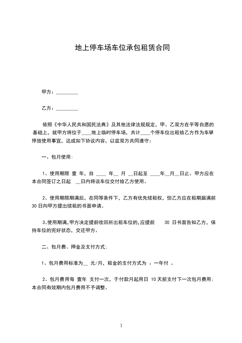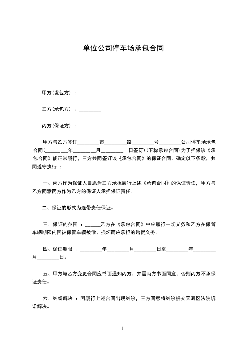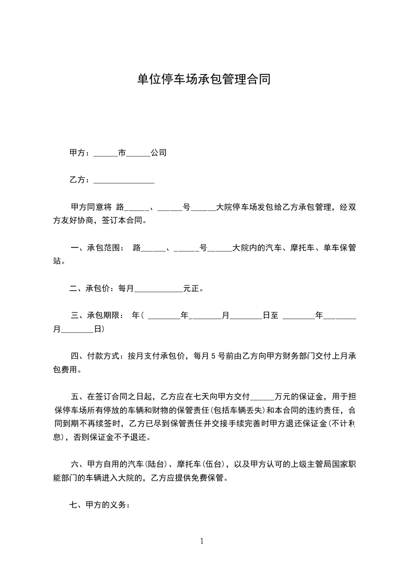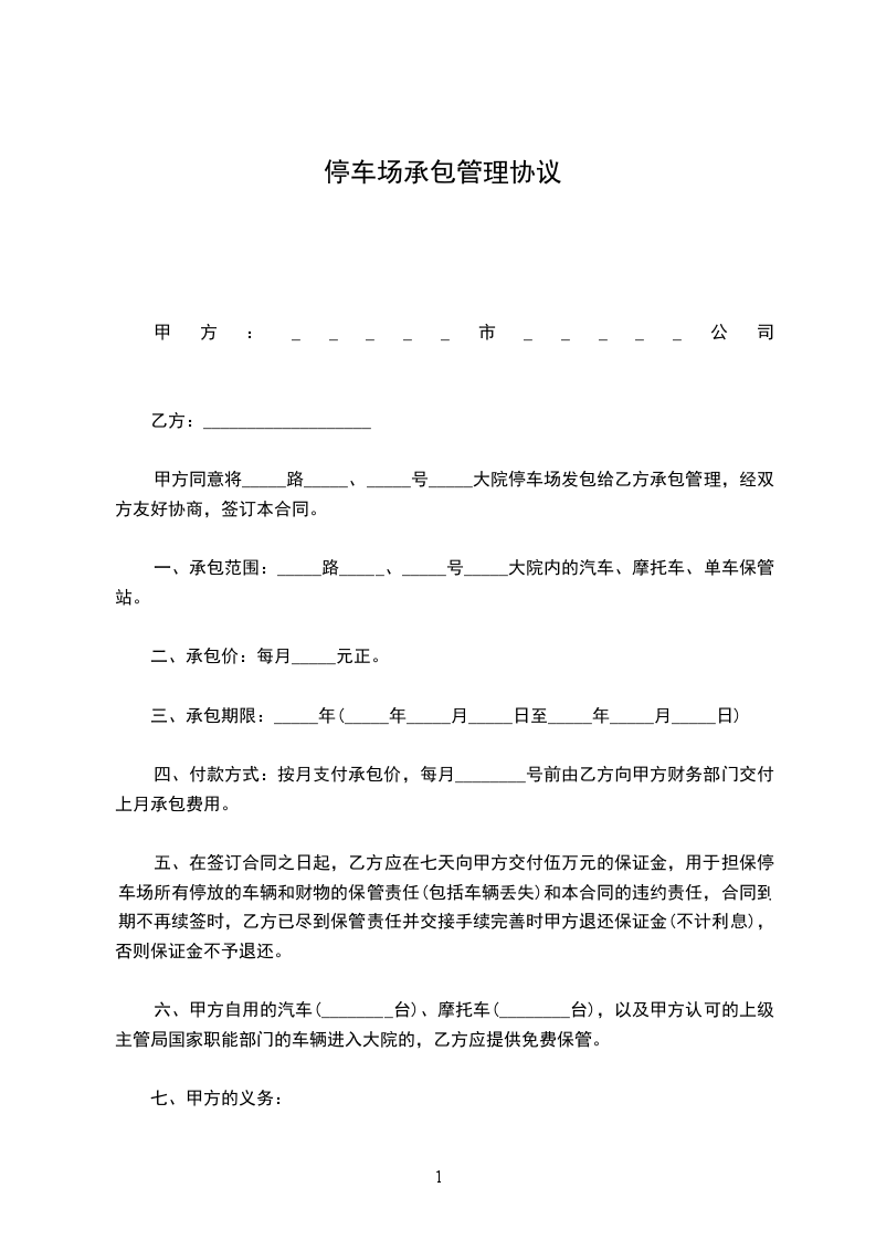 五、在签订合同之日起,乙方应在七天向甲方交付______万元的保证金,用于担保停车场所有停放的车辆和财物的保管责任(包括车辆丢失)和本合同的违约责任,合同到期不再续签时,乙方已尽到保管责任并交接手续完善时甲方退还保证金(不计利息),否则保证金不予退还。