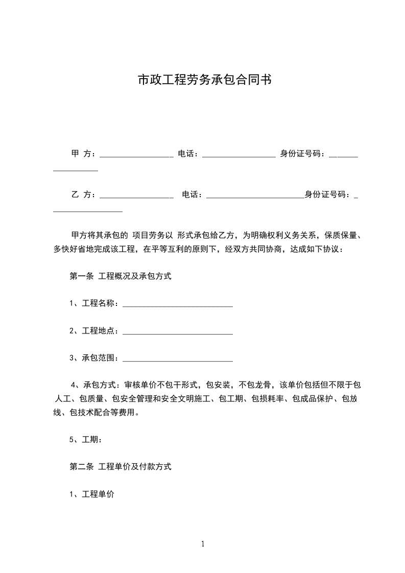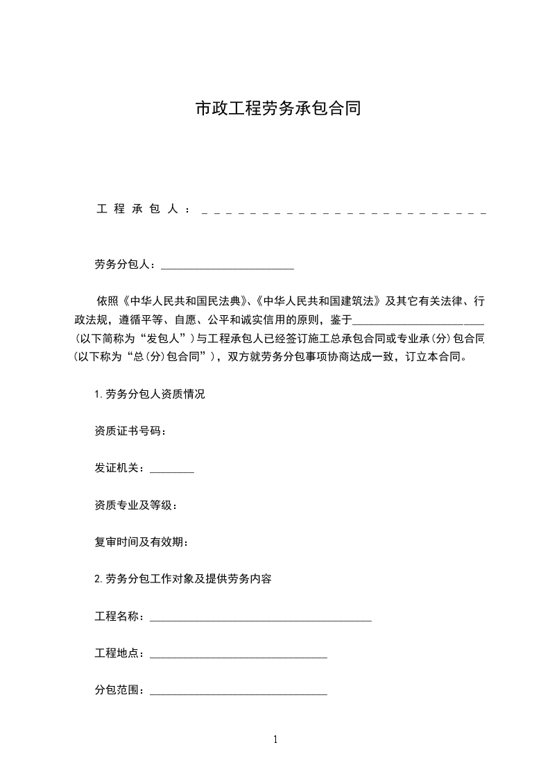 依照《中华人民共和国民法典》、《中华人民共和国建筑法》及其它有关法律、行政法规,遵循平等、自愿、公平和诚实信用的原则,鉴于________________________(以下简称为“发包人”)与工程承包人已经签订施工总承包合同或专业承(分)包合同(以下称为“总(分)包合同”),双方就劳务分包事项协商达成一致,订立本合同。