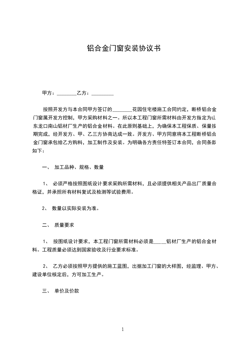 按照开发方与本合同甲方签订的________花园住宅楼施工合同约定,断桥铝合金门窗属开发方控制,甲方采购材料之一。所以本工程门窗所需材料由开发方指定为山东龙口南山铝材厂生产的铝合金材料。在此原则基础上,为确保本工程保质、保量按期完成,经开发方、甲、乙三方协商达成一致。开发方、甲方同意将本工程断桥铝合金门窗承包给乙方购料,加工制作及安装。为明确各方责任特签订本合同,合同条款如下: