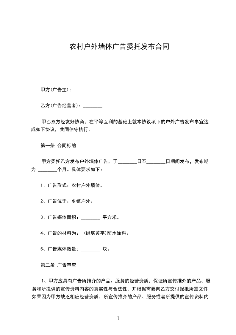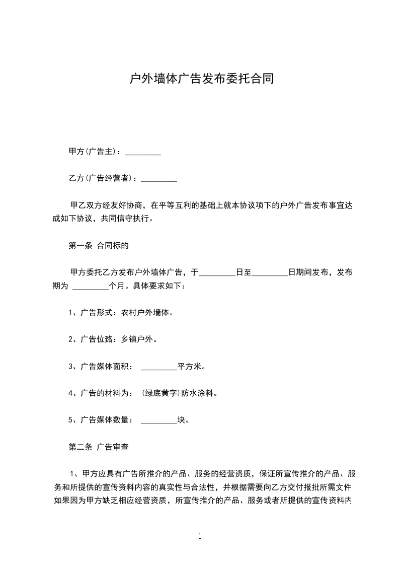 甲方委托乙方发布户外墙体广告,于_________日至_________日期间发布,发布期为 _________个月。具体要求如下: