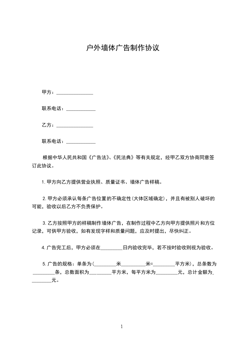 2、墙体广告制作必须完全按照甲方提供的“墙体制作标准”执行,字体及版面尺寸不允许改动。平均每幅_________平方,高度_________米-_________米。