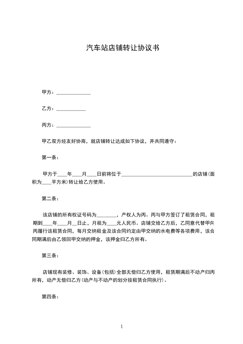甲方于____年____月____日前将位于_____________________________的店铺(面积为____平方米)转让给乙方使用。