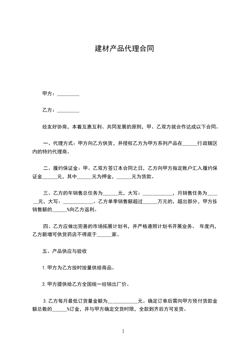 一、代理方式:甲方向乙方供货,并授权乙方为甲方系列产品在______行政辖区内的特约代理商。