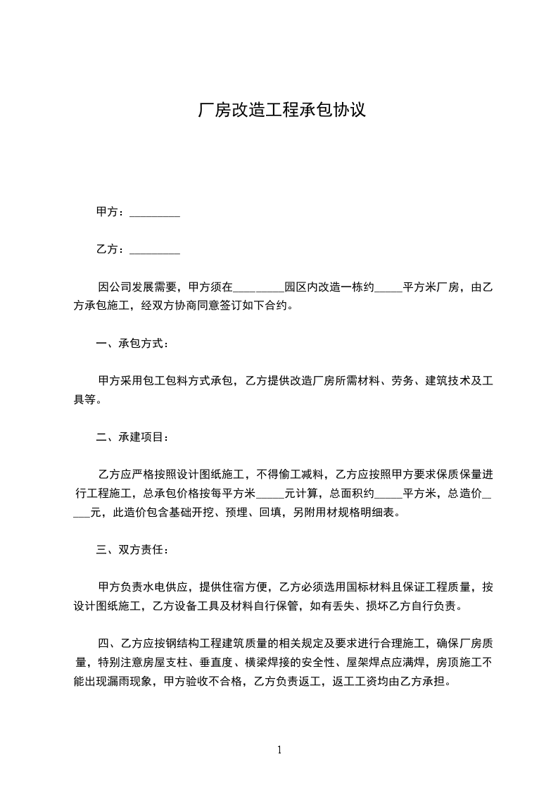 因公司发展需要,甲方须在_________园区内改造一栋约_____平方米厂房,由乙方承包施工,经双方协商同意签订如下合约。
