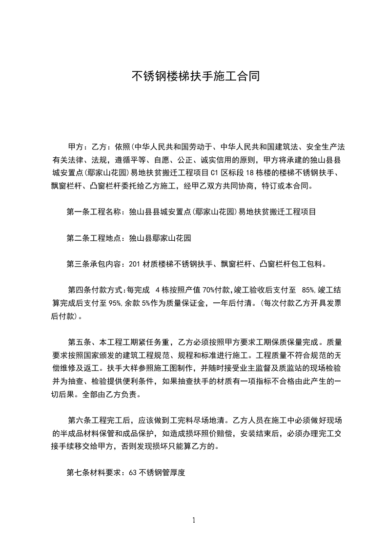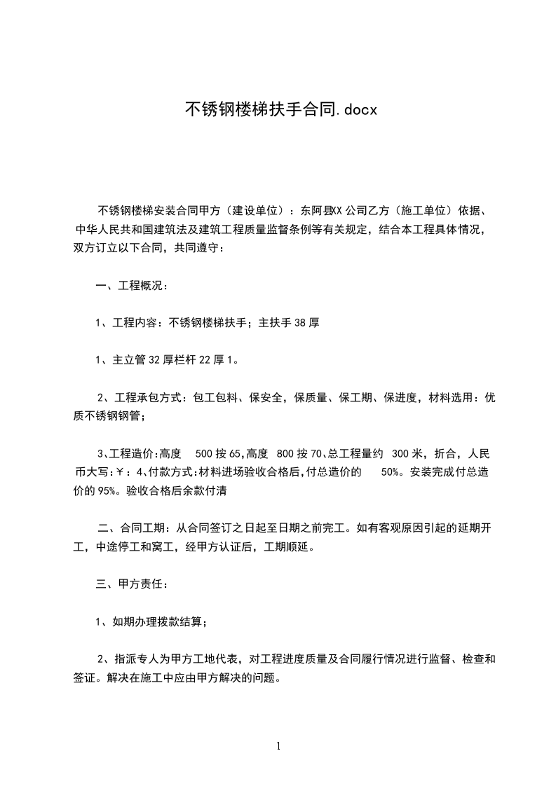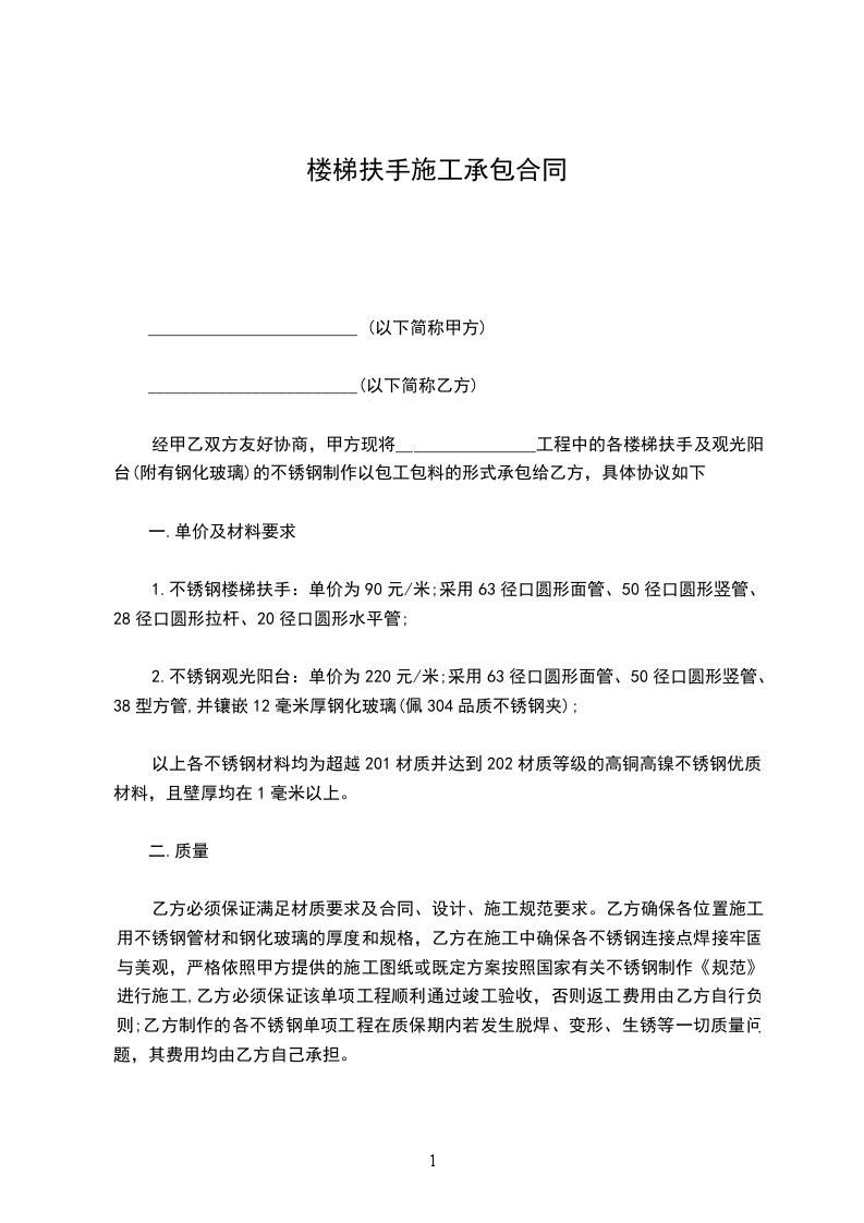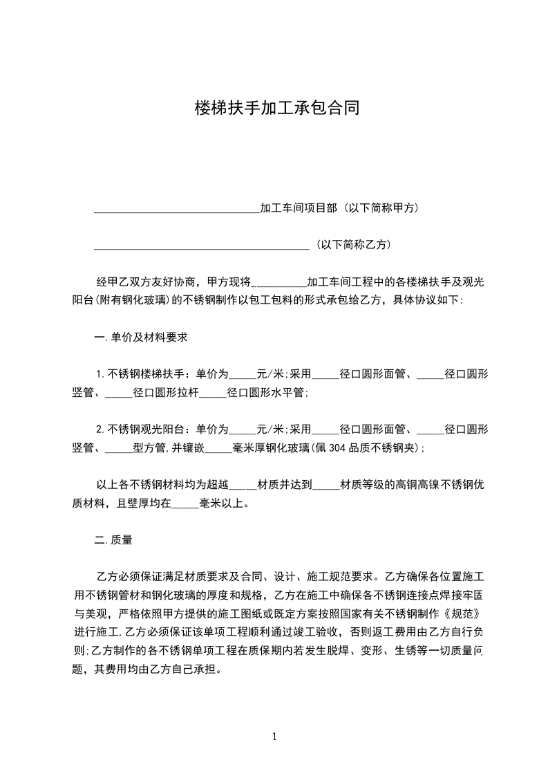 经甲乙双方友好协商,甲方现将__________加工车间工程中的各楼梯扶手及观光阳台(附有钢化玻璃)的不锈钢制作以包工包料的形式承包给乙方,具体协议如下: