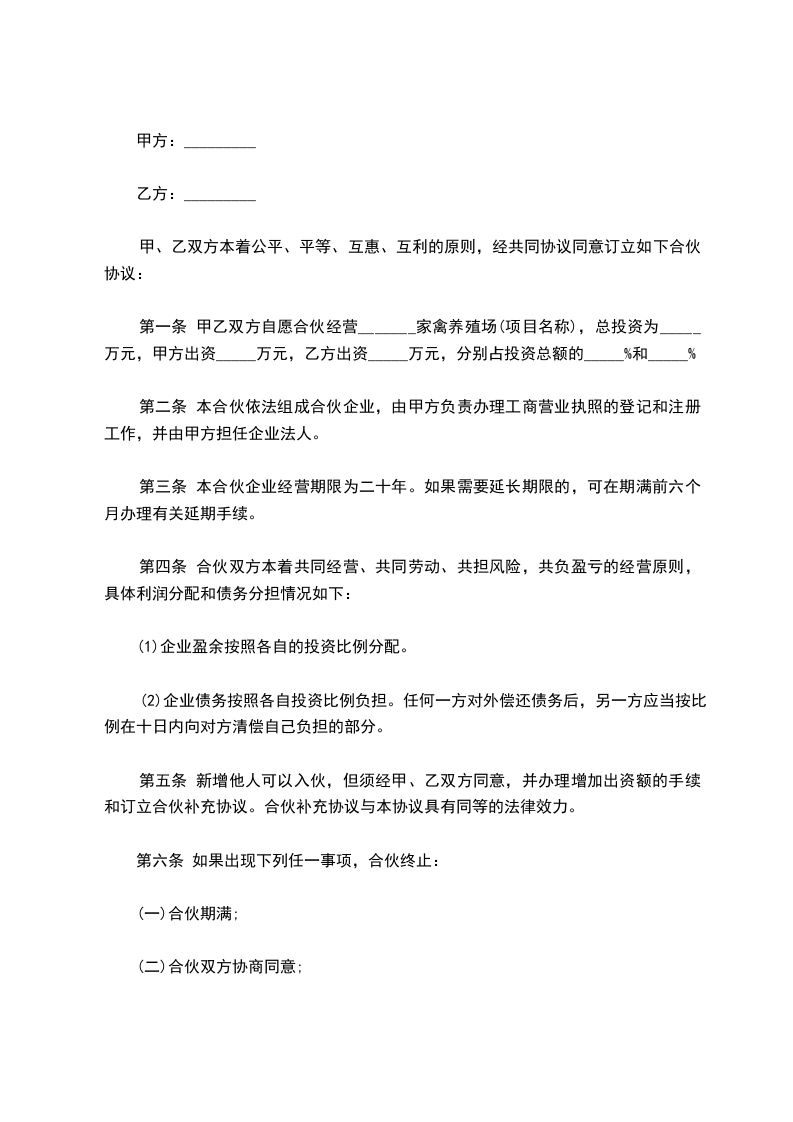 第一条 甲乙双方自愿合伙经营_______家禽养殖场(项目名称),总投资为_____万元,甲方出资_____万元,乙方出资_____万元,分别占投资总额的_____%和_____%。