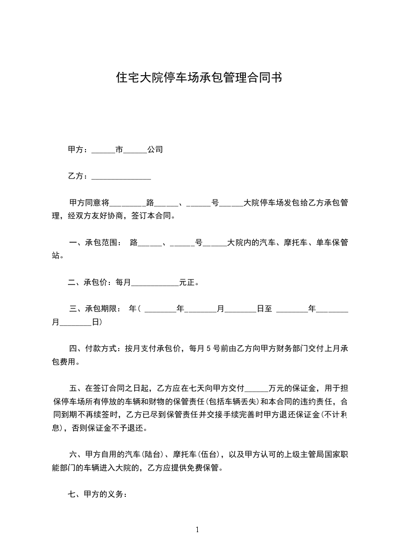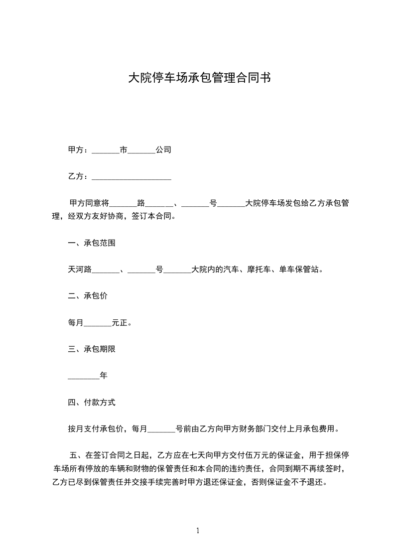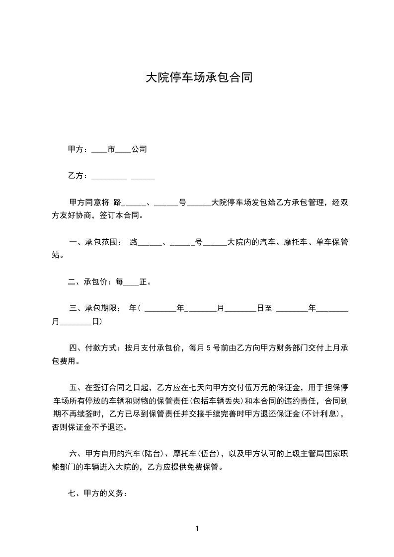 甲方同意将 路______、______号______大院停车场发包给乙方承包管理,经双方友好协商,签订本合同。