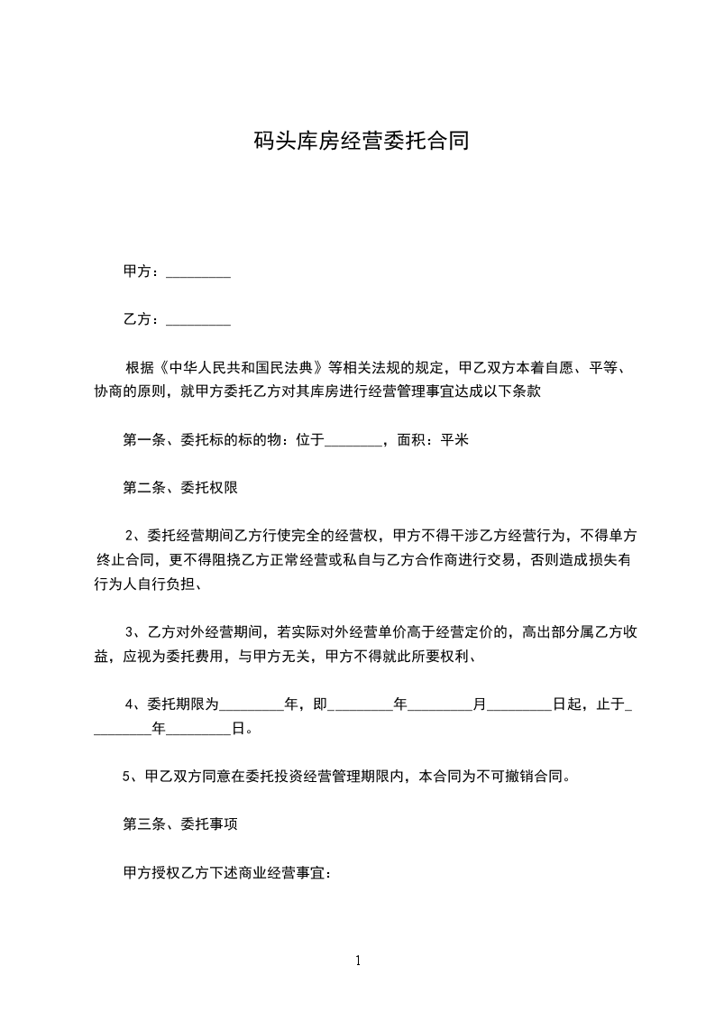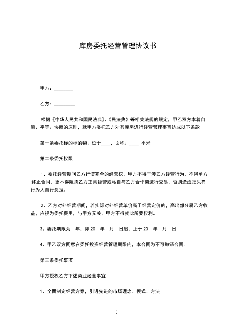 根据《中华人民共和国民法典》、《民法典》等相关法规的规定,甲乙双方本着自愿、平等、协商的原则,就甲方委托乙方对其库房进行经营管理事宜达成以下条款