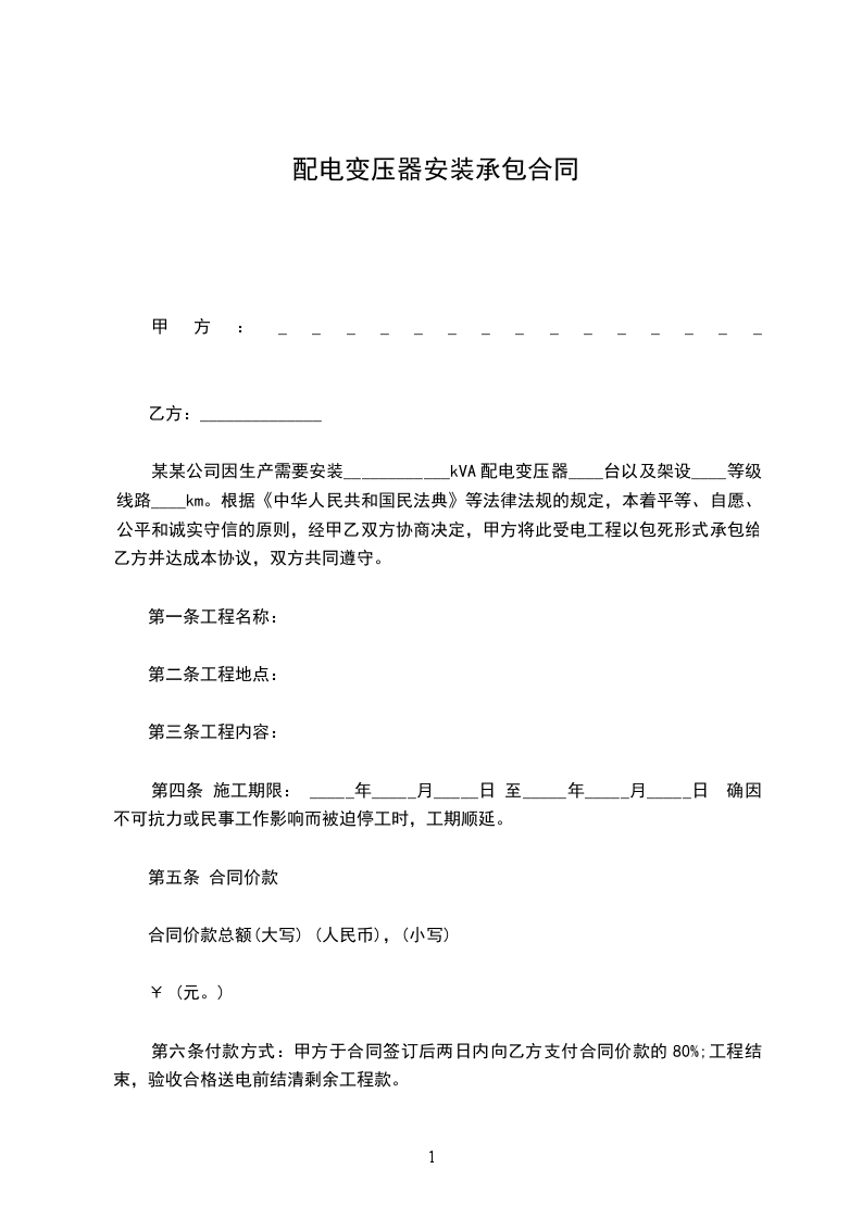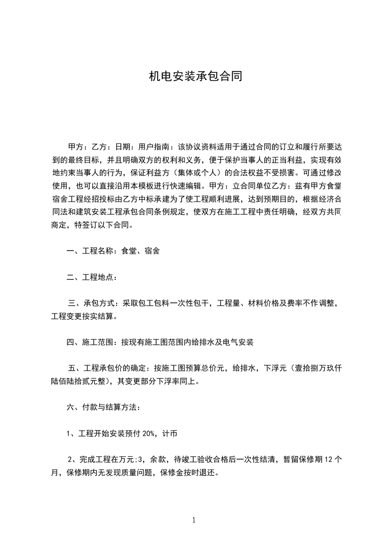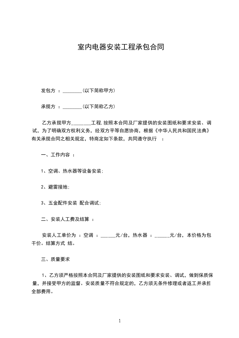 双方就__________电器安装工程分项承包签订如下条款: