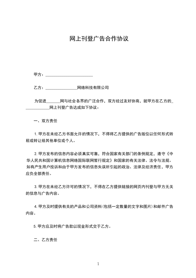 为促进_______网与社会各界的广泛合作,双方经过友好协商,就甲方在乙方的_____________网上刊登广告达成如下协议: