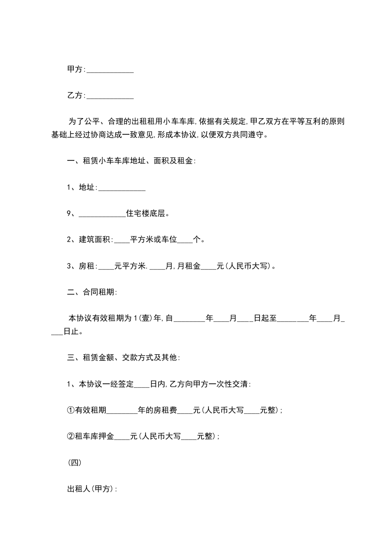 为了公平、合理的出租租用小车车库,依据有关规定,甲乙双方在平等互利的原则基础上经过协商达成一致意见,形成本协议,以便双方共同遵守。
