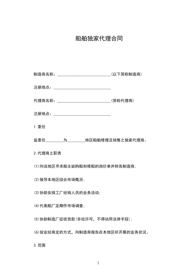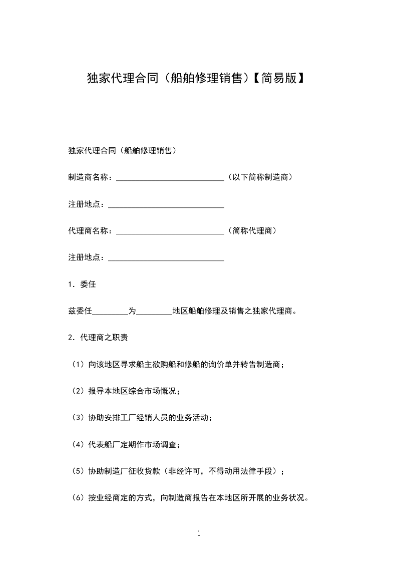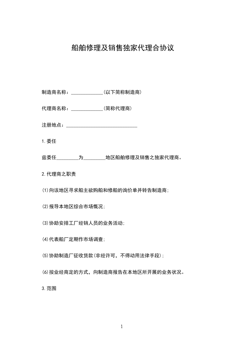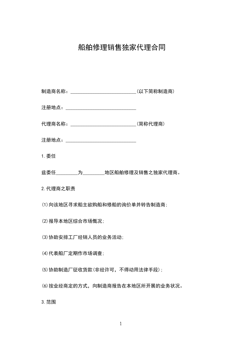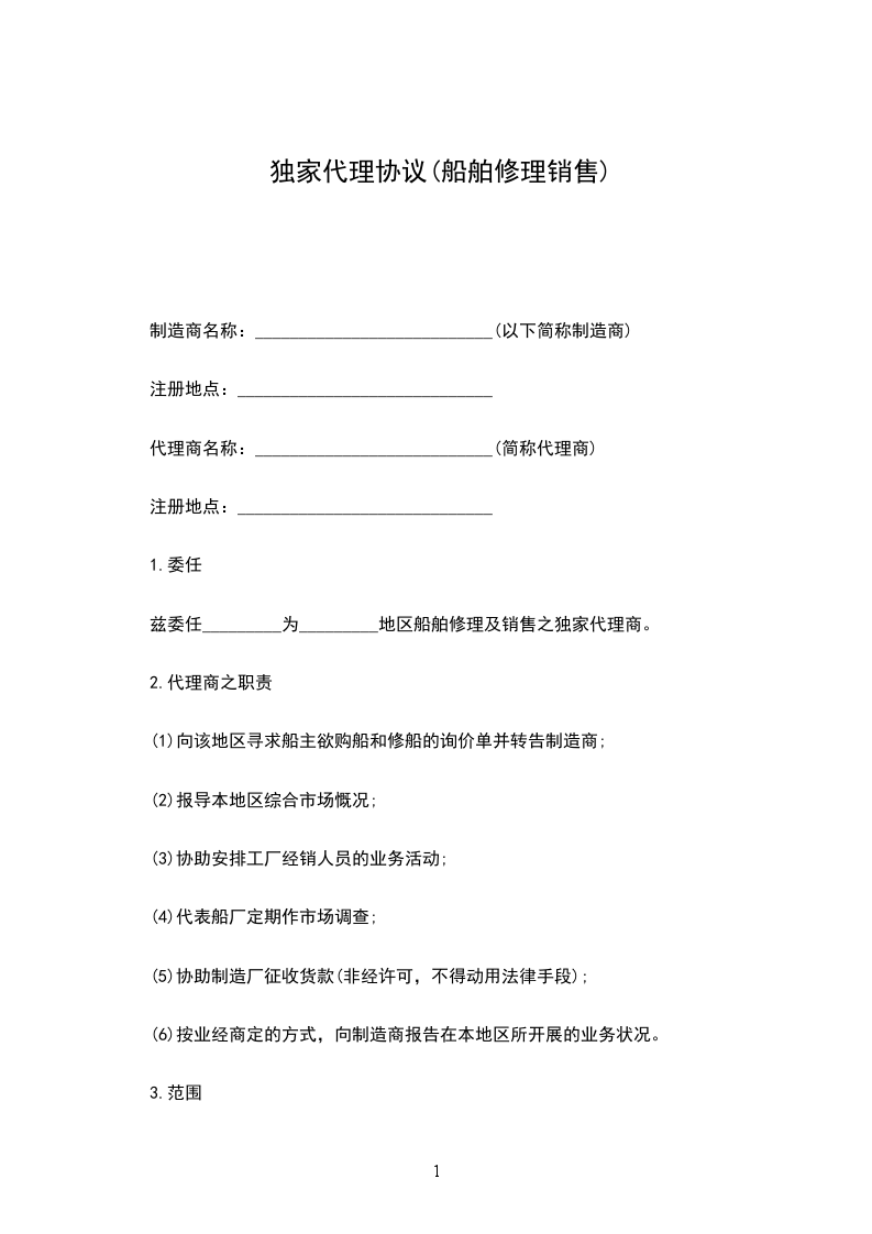 兹委任_________为_________地区船舶修理及销售之独家代理商。
