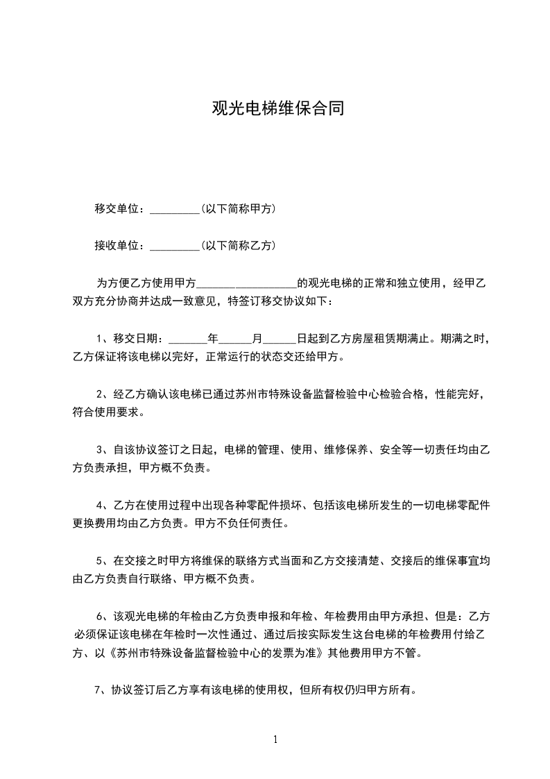 1、移交日期:_______年______月______日起到乙方房屋租赁期满止。期满之时,乙方保证将该电梯以完好,正常运行的状态交还给甲方。