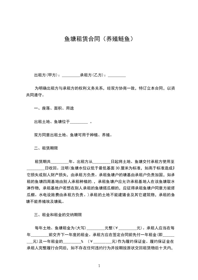 租赁期共_________年。出租方从_________日起将土地、鱼塘交付承租方使用至_________日收回。注明(鱼塘水位以低于最低基面30厘米为标准,如高于标准造成其它损失或别人财产损失,由承租方负责。承租鱼塘户的塘基由承租户负责加固,如承租的鱼塘四周基地由别人承租种植的.,承租鱼塘户应允许承租基地人在该鱼塘取水淋作物,承租基地户若想在别人承租的鱼塘搭瓜棚的,应征得承租鱼塘户同意方能搭瓜棚。水电设施费由承租方负责。)承租的土地不能建猪舍及其它建筑物,承租的鱼塘不能养殖埃及塘虱。