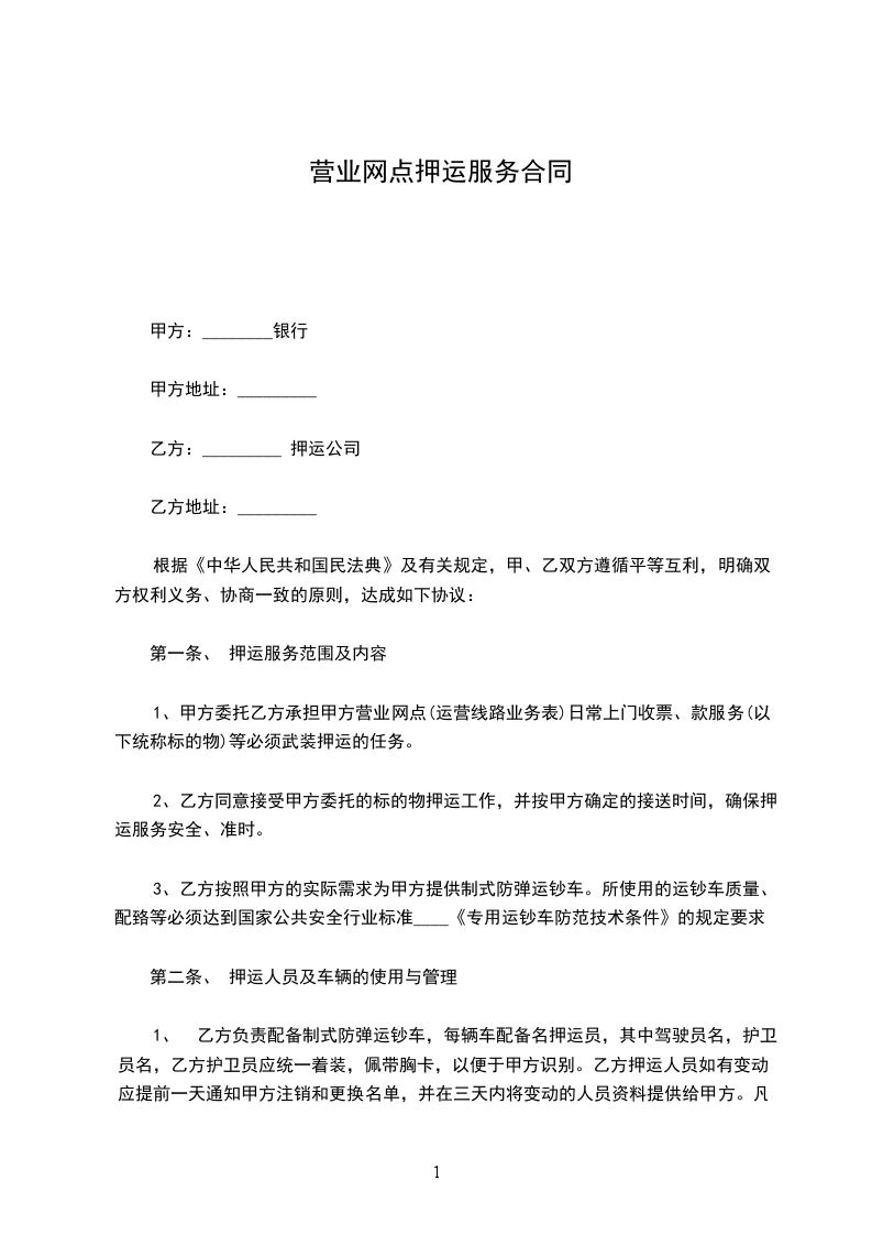 1、甲方委托乙方承担甲方营业网点(运营线路业务表)日常上门收票、款服务(以下统称标的物)等必须武装押运的任务。