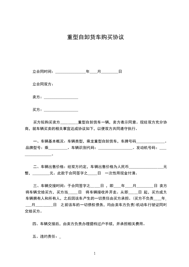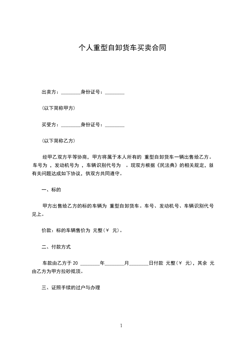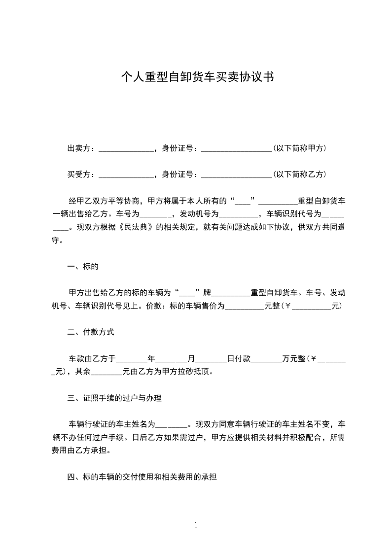 经甲乙双方平等协商,甲方将属于本人所有的“____”__________重型自卸货车一辆出售给乙方。车号为________,发动机号为__________,车辆识别代号为__________。现双方根据《民法典》的相关规定,就有关问题达成如下协议,供双方共同遵守。