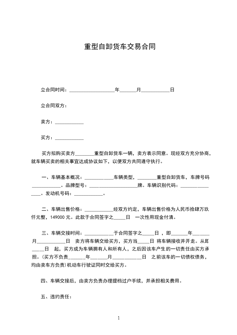 甲方出售给乙方的标的车辆为“____”牌__________重型自卸货车。车号、发动机号、车辆识别代号见上。价款:标的车辆售价为__________元整(¥__________元)。