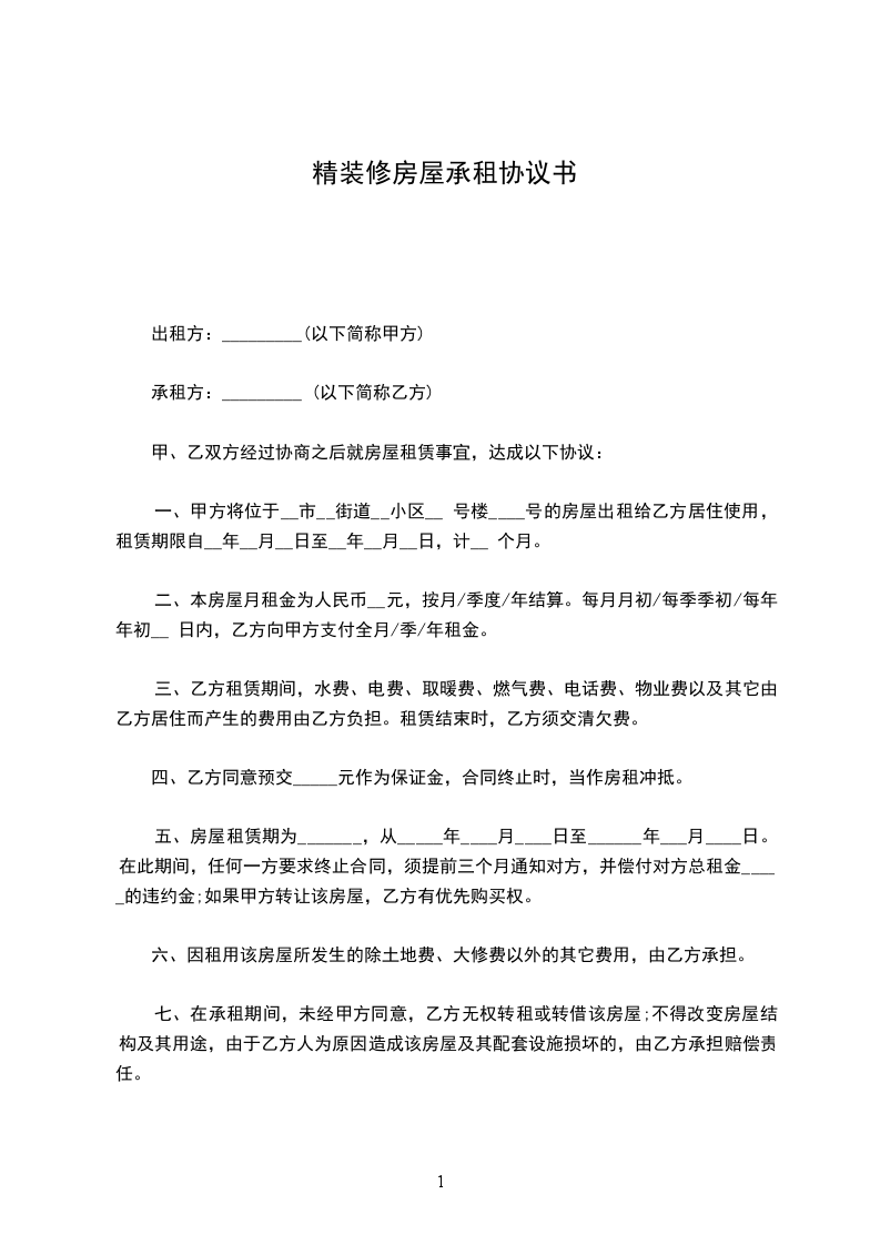 一、甲方将位于__市__街道__小区__ 号楼____号的房屋出租给乙方居住使用,租赁期限自__年__月__日至__年__月__日,计__ 个月。