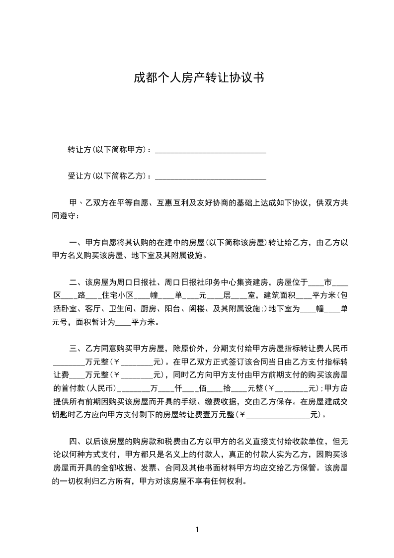 一、甲方自愿将其认购的在建中的房屋(以下简称该房屋)转让给乙方,由乙方以甲方名义购买该房屋、地下室及其附属设施。