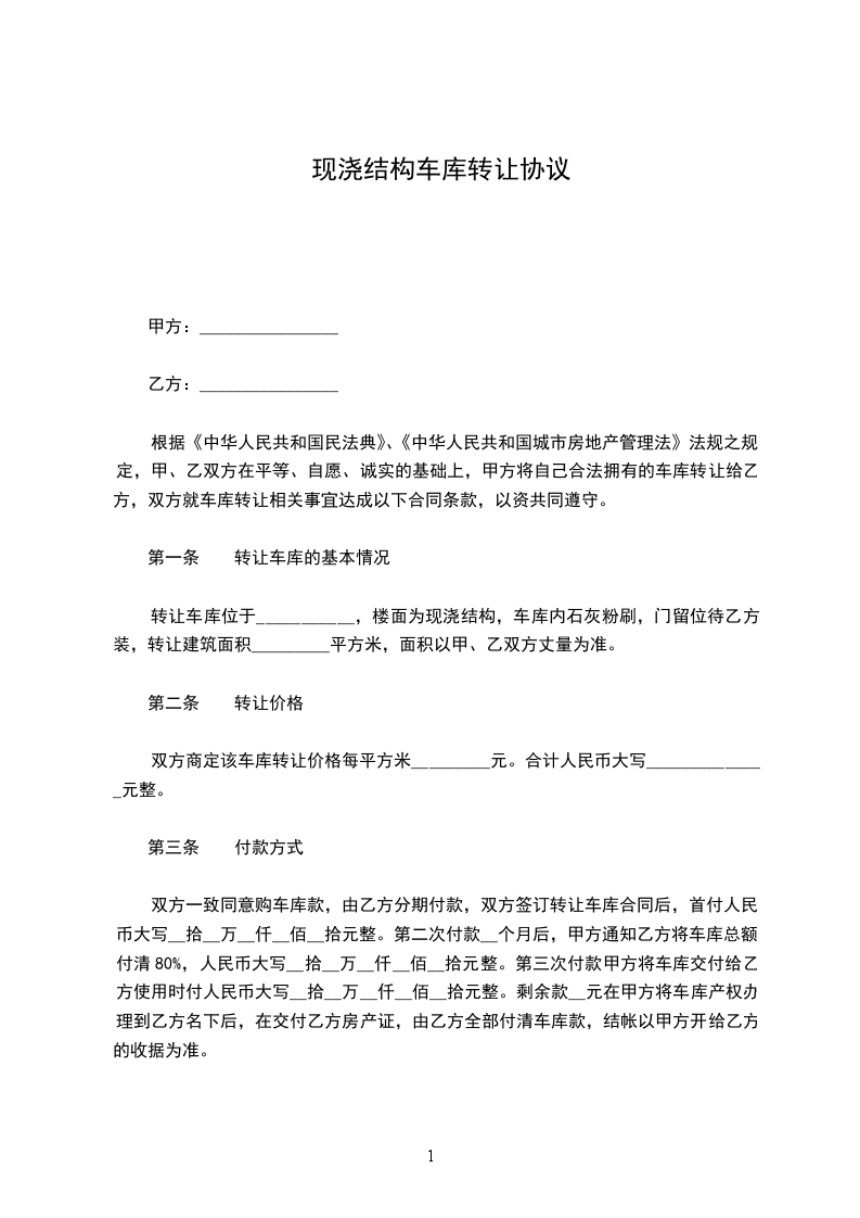 转让车库位于___________,楼面为现浇结构,车库内石灰粉刷,门留位待乙方装,转让建筑面积_________平方米,面积以甲、乙双方丈量为准。