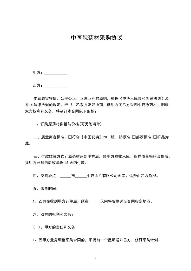 本着诚实守信、公平公正、互惠互利的原则,根据《中华人民共和国民法典》及相关法律法规的规定,经甲、乙双方友好协商,就甲方向乙方采购中药原药材,明确双方权利和义务,特制订本合同以下条款: