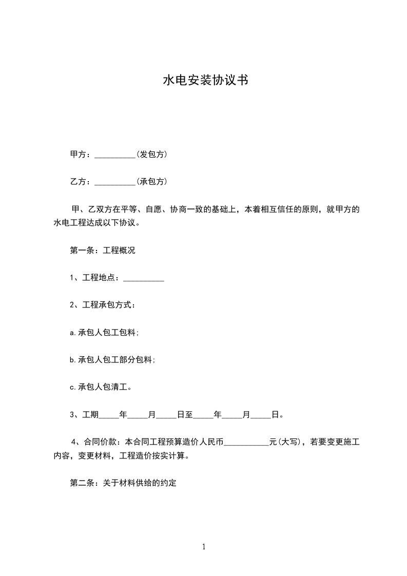 甲、乙双方在平等、自愿、协商一致的基础上,本着相互信任的原则,就甲方的水电工程达成以下协议。