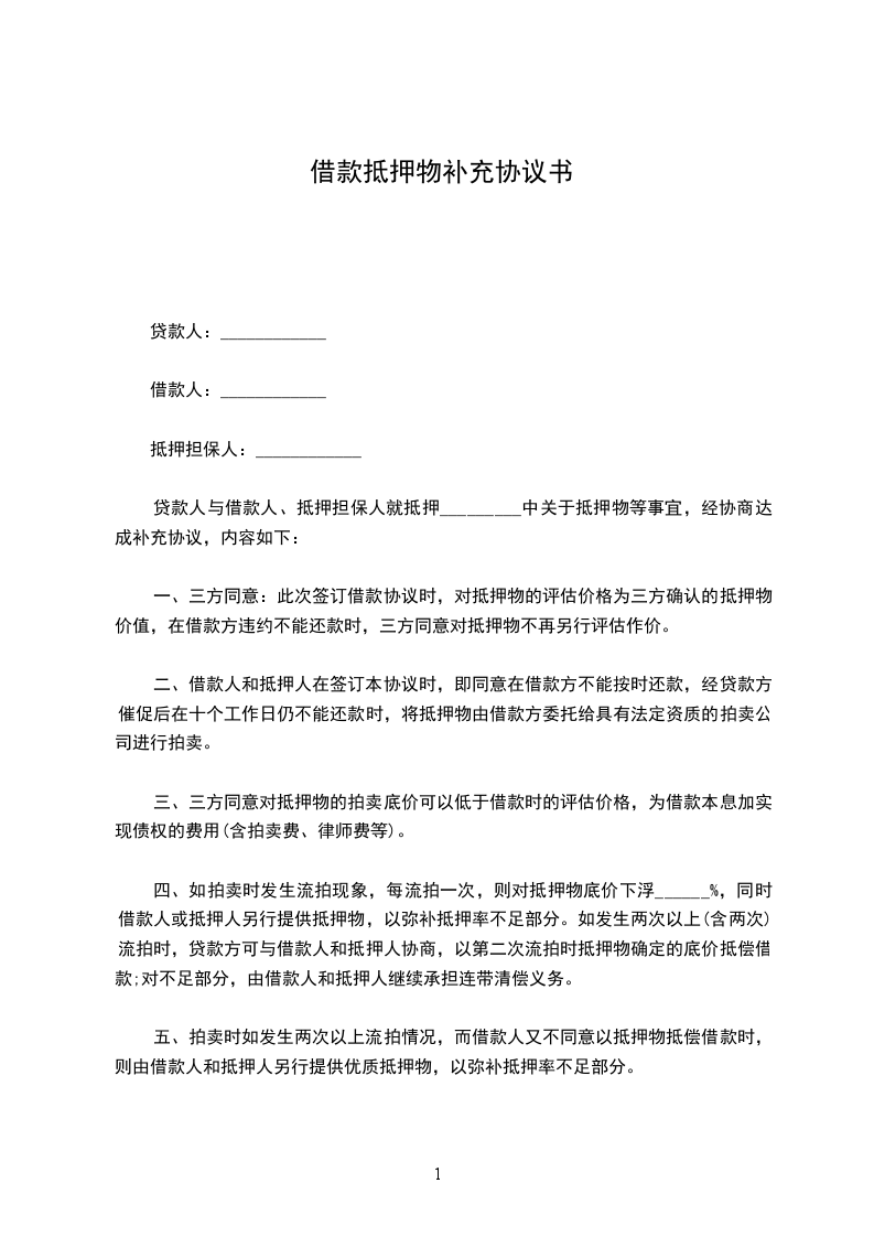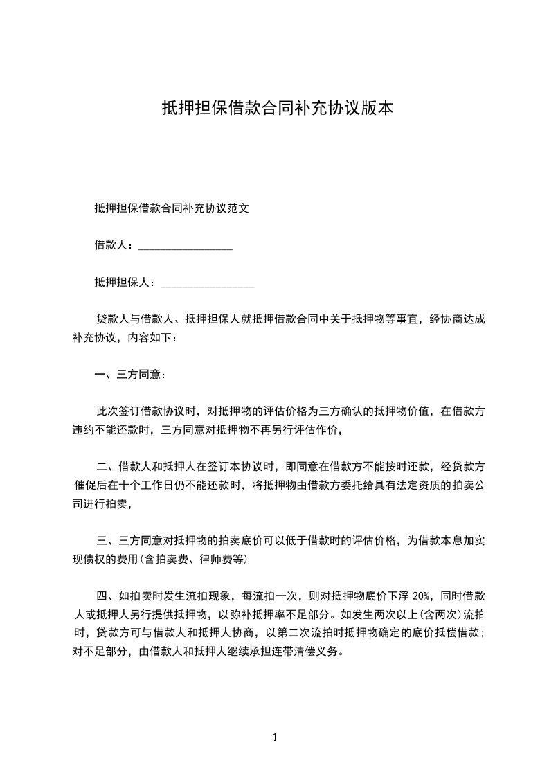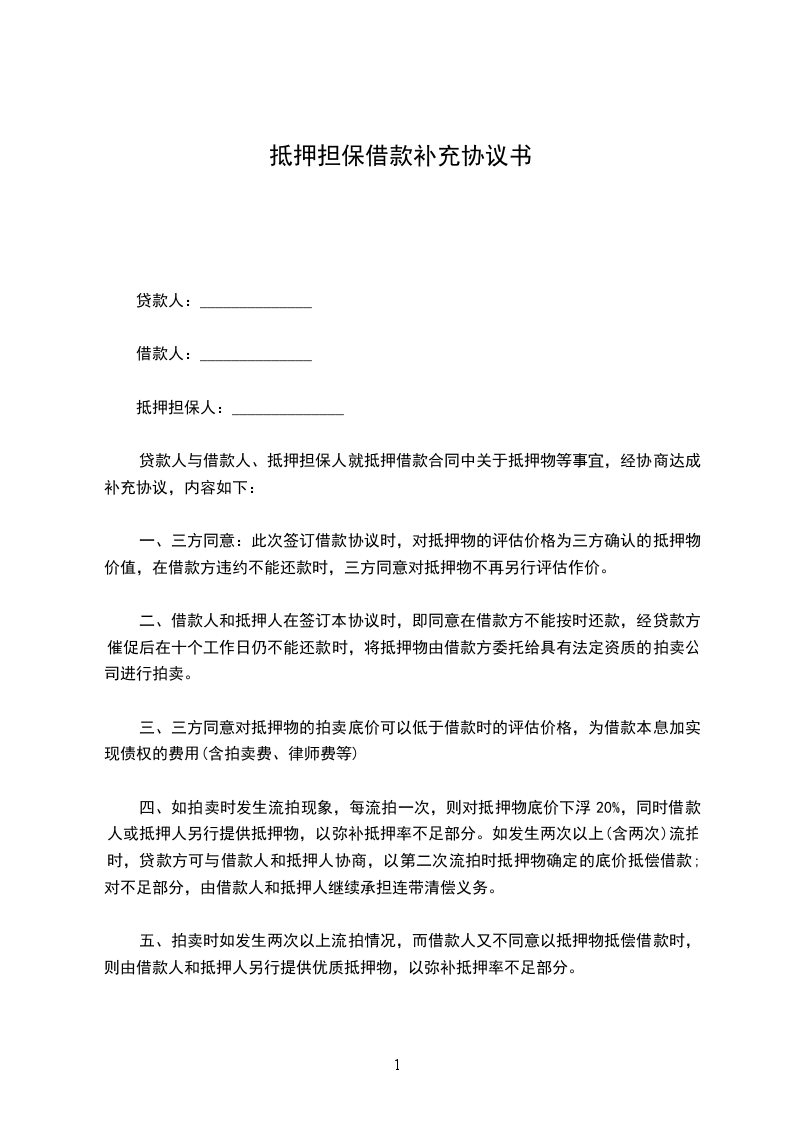 一、三方同意:此次签订借款协议时,对抵押物的评估价格为三方确认的抵押物价值,在借款方违约不能还款时,三方同意对抵押物不再另行评估作价。