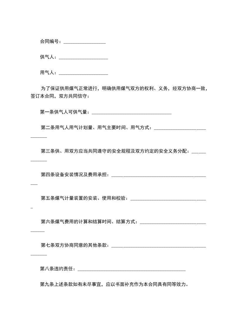 为了保证供用煤气正常进行,明确供用煤气双方的权利、义务,经双方协商一致,签订本合同,双方共同信守: