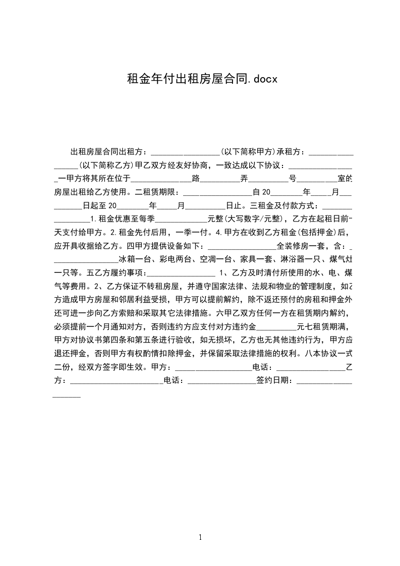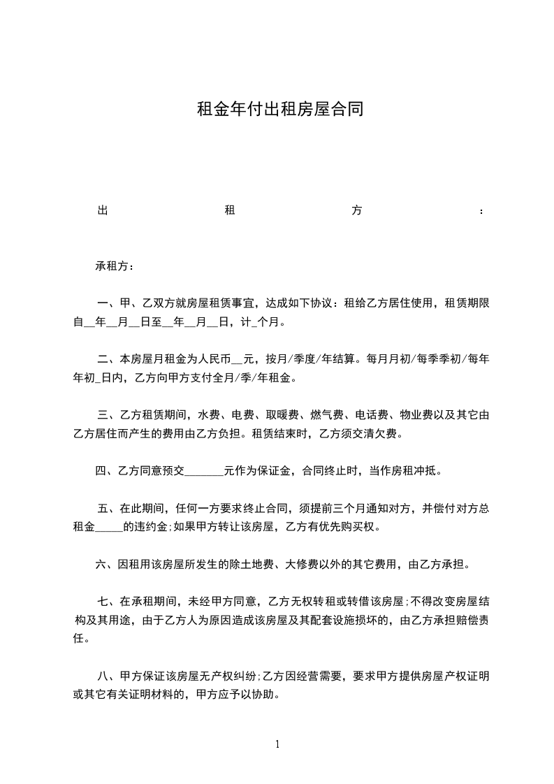 第三条 租金。该房屋租金为每年(____)___万___仟___佰__拾__元整。