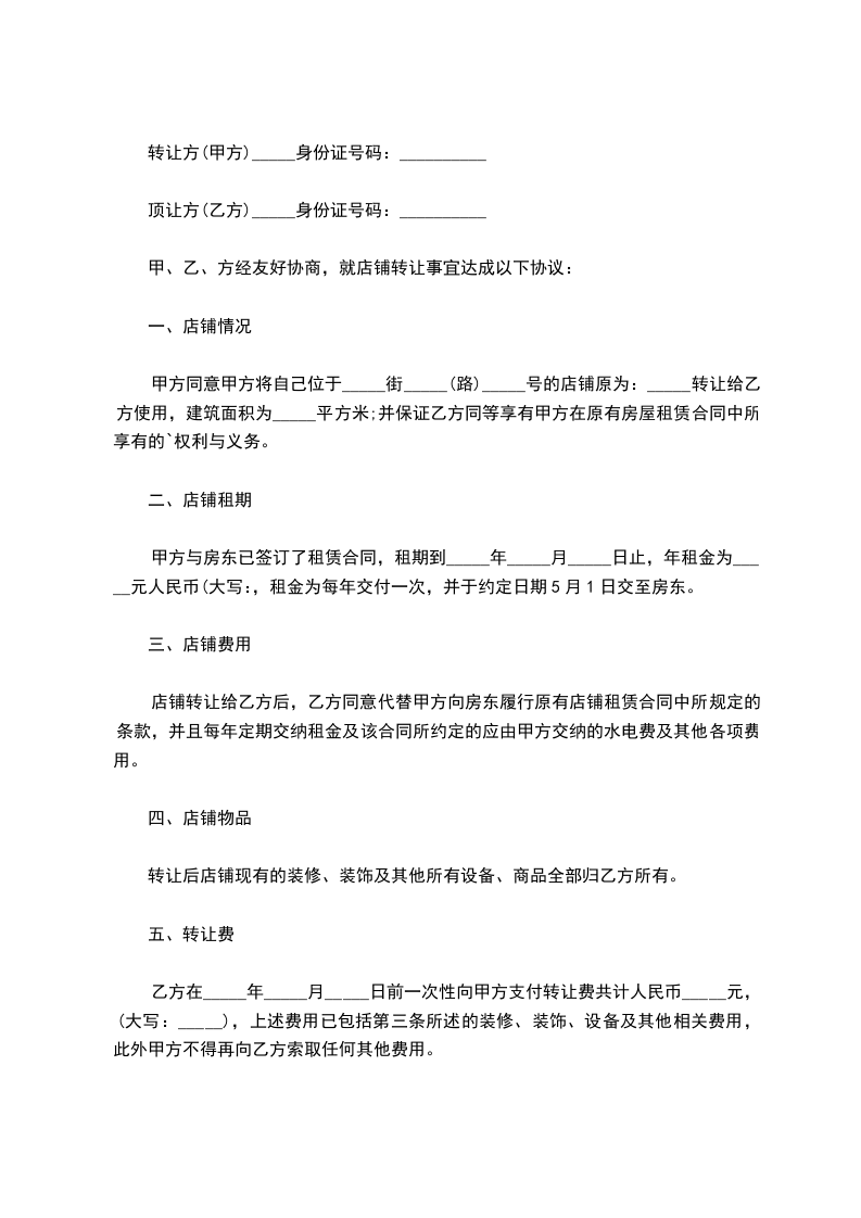 乙方在_____年_____月_____日前一次性向甲方支付转让费共计人民币_____元,(大写:_____),上述费用已包括第三条所述的装修、装饰、设备及其他相关费用,此外甲方不得再向乙方索取任何其他费用。