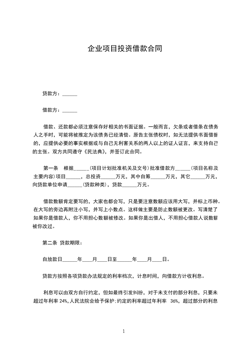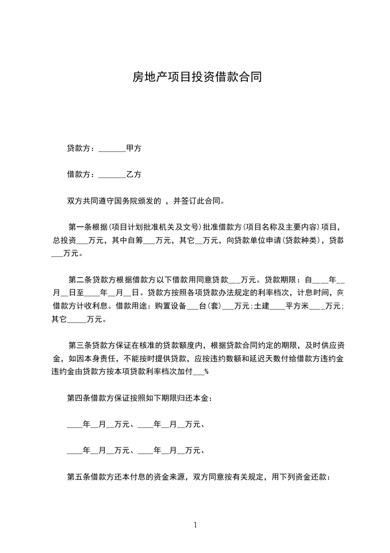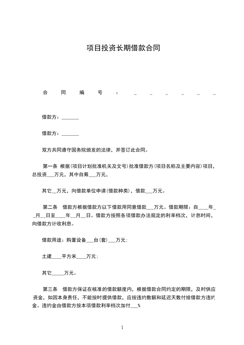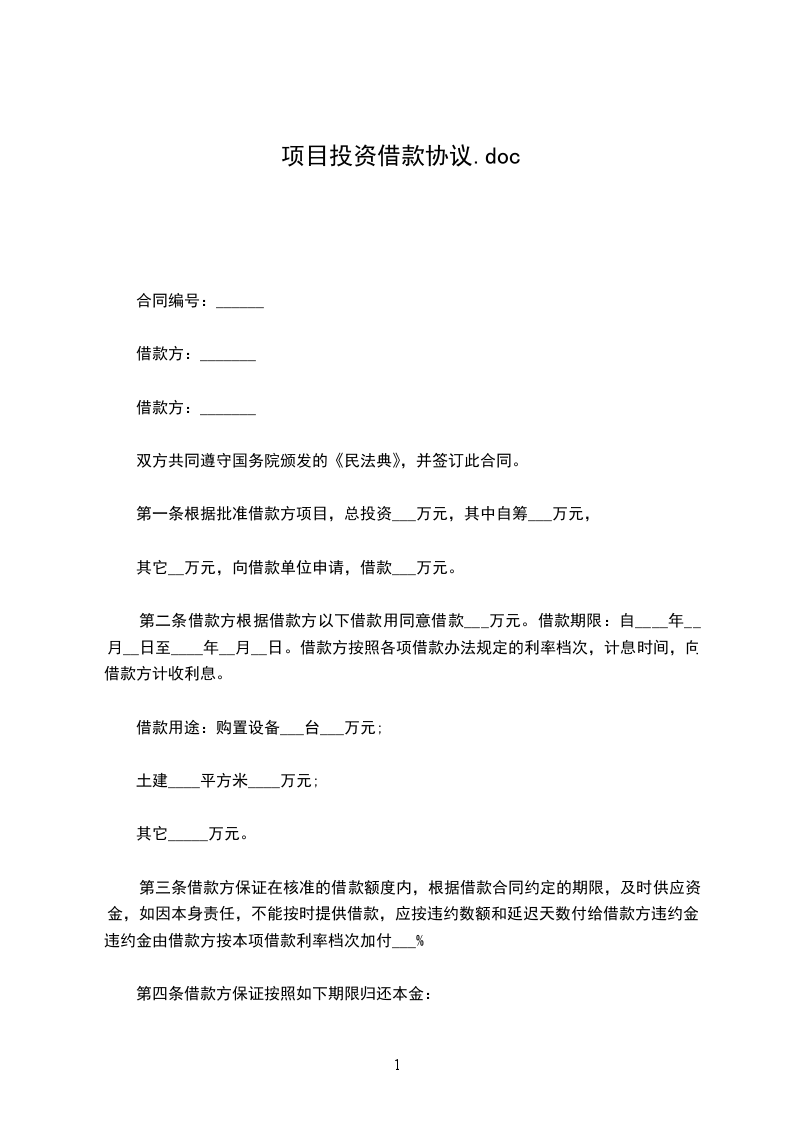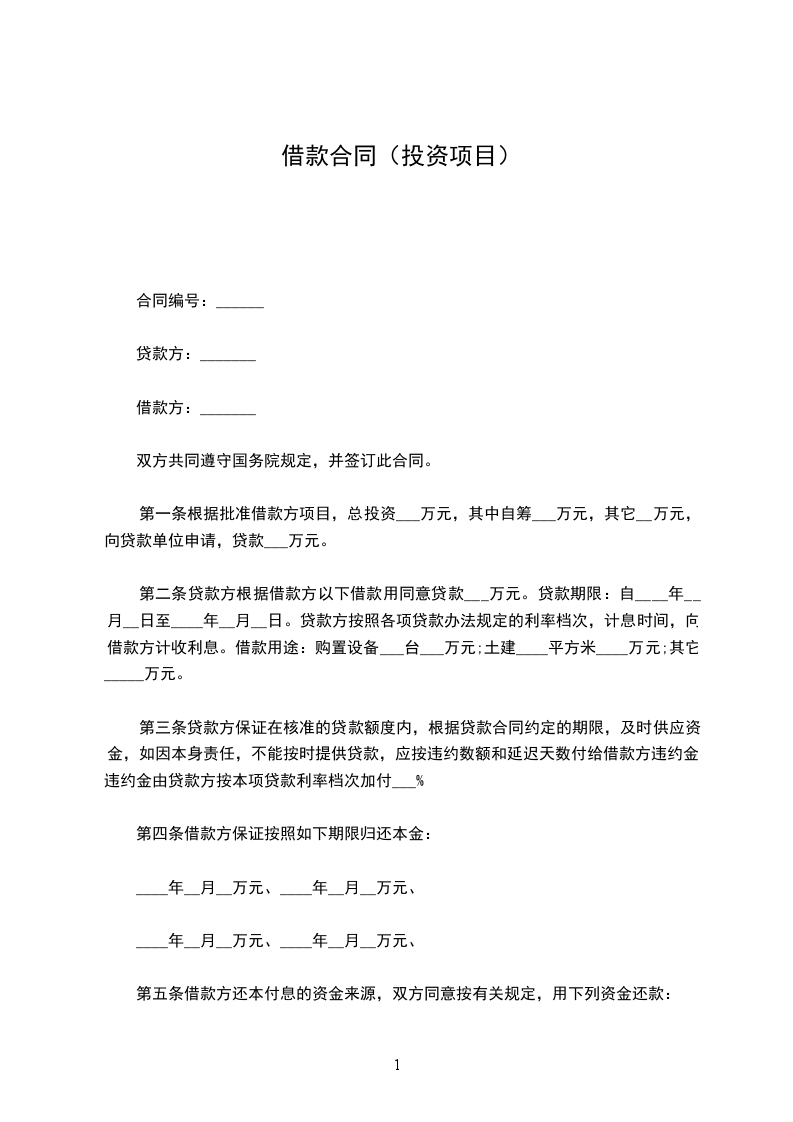 第一条 根据_________批准借款方_________项目,总投资___万元,其中自筹___万元,其它__万元,向贷款单位申请_________,贷款___万元。
