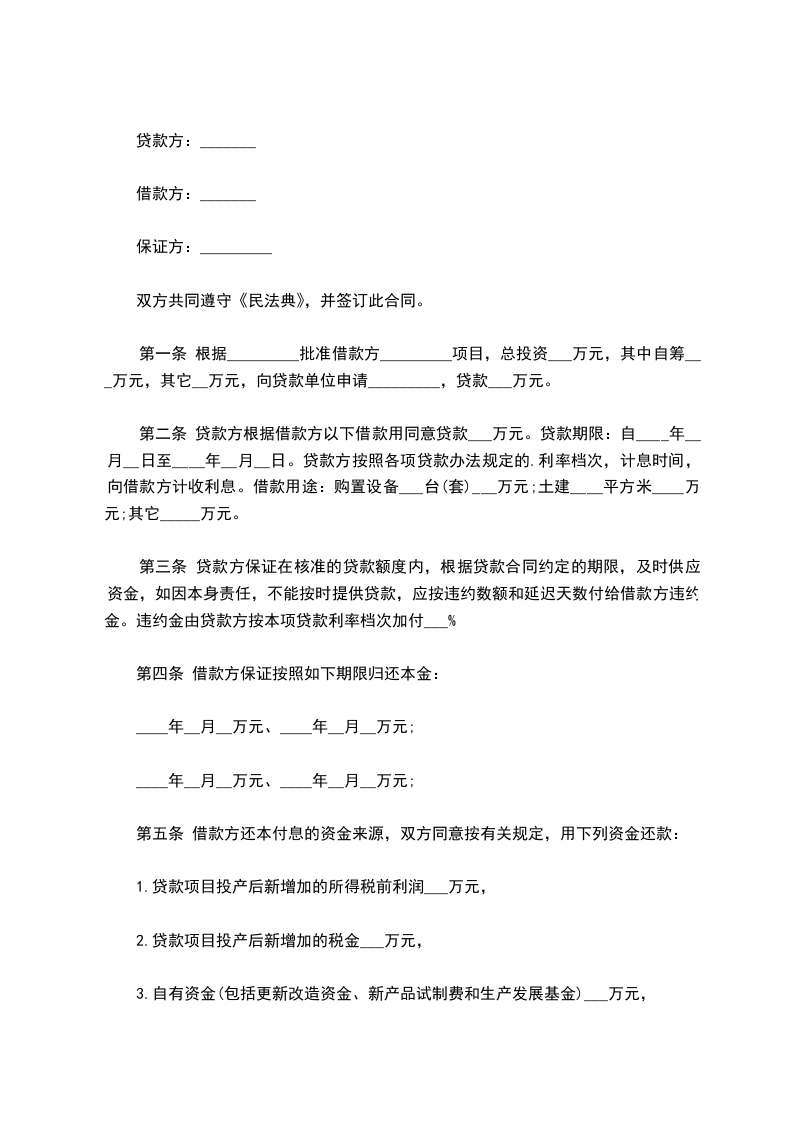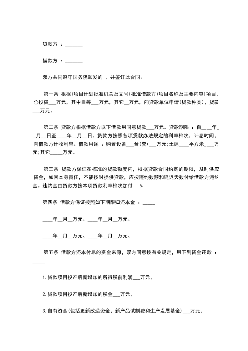第二条 贷款方根据借款方以下借款用同意贷款___万元。贷款期限:自____年__月__日至____年__月__日。贷款方按照各项贷款办法规定的.利率档次,计息时间,向借款方计收利息。借款用途:购置设备___台(套)___万元;土建____平方米____万元;其它_____万元。