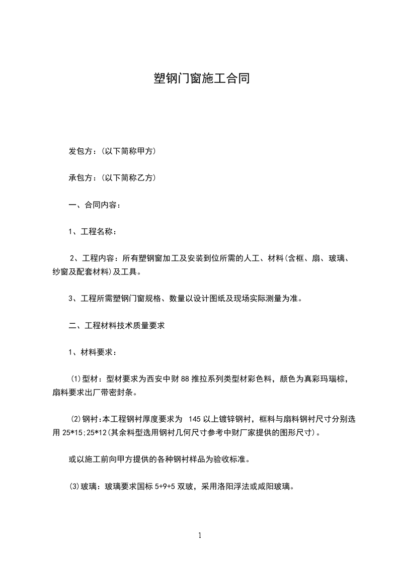 一、 乙方:_________ 铝合金窗型材,虎标牌。L70型材,玻璃厚4mm,型材厚度1.0mm,120元/方;上方玻璃厚5mm,60元/米。