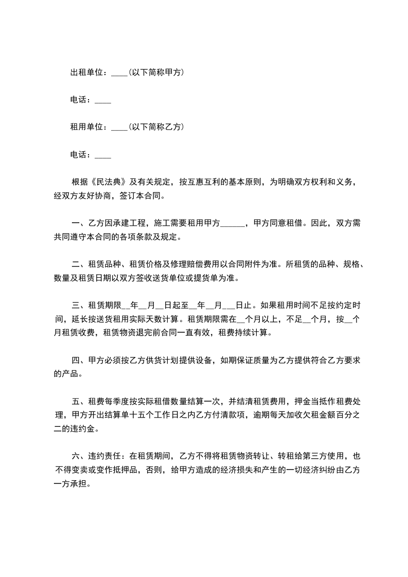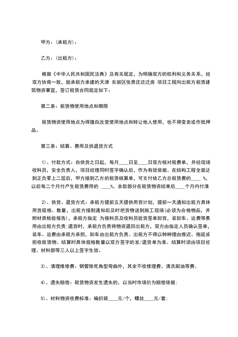 四、租金价格标准为,每天钢管 ________元/套。从乙方收到甲方租赁物资的当日起计算租金,以甲方收发材料明细表为准,租金按月结算,算满一个月,乙方向甲方支付一次租金,逾期甲方向乙方按日加收1%的违约金。