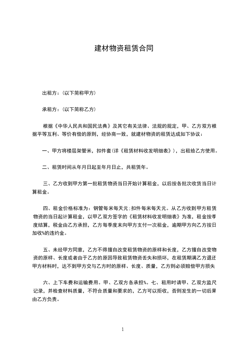 根据《中华人民共和国民法典》及其它有关法律、法规的规定,甲、乙方双方根据平等互利、等价有偿的原则,经协商一致,就建材物资的租赁达成如下协议: