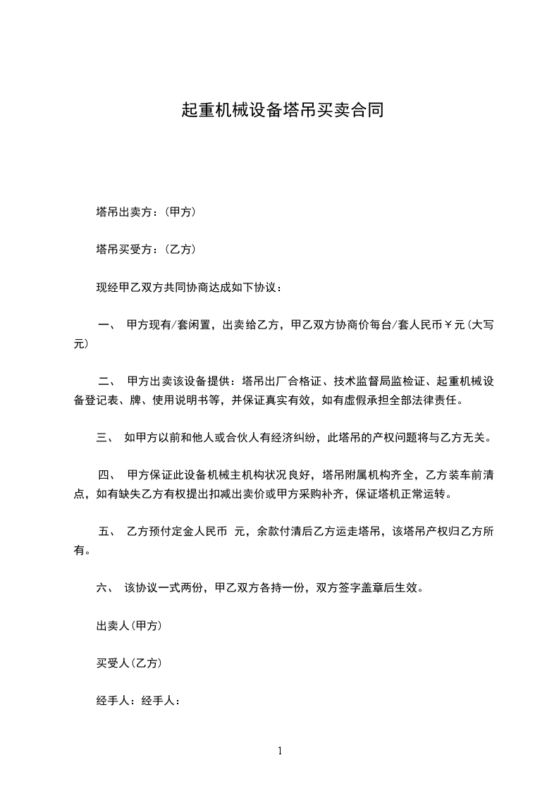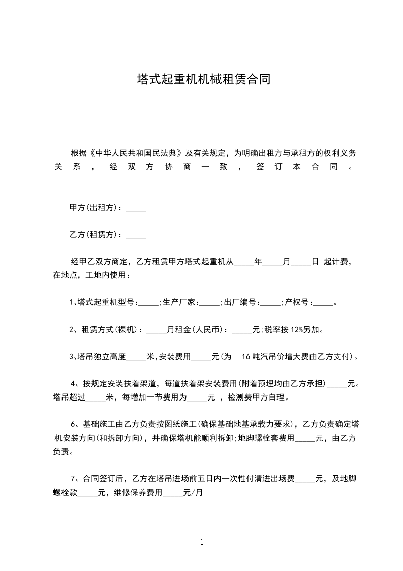7、合同签订后,乙方在塔吊进场前五日内一次性付清进出场费_____元,及地脚螺栓款_____元,维修保养费用_____元/月