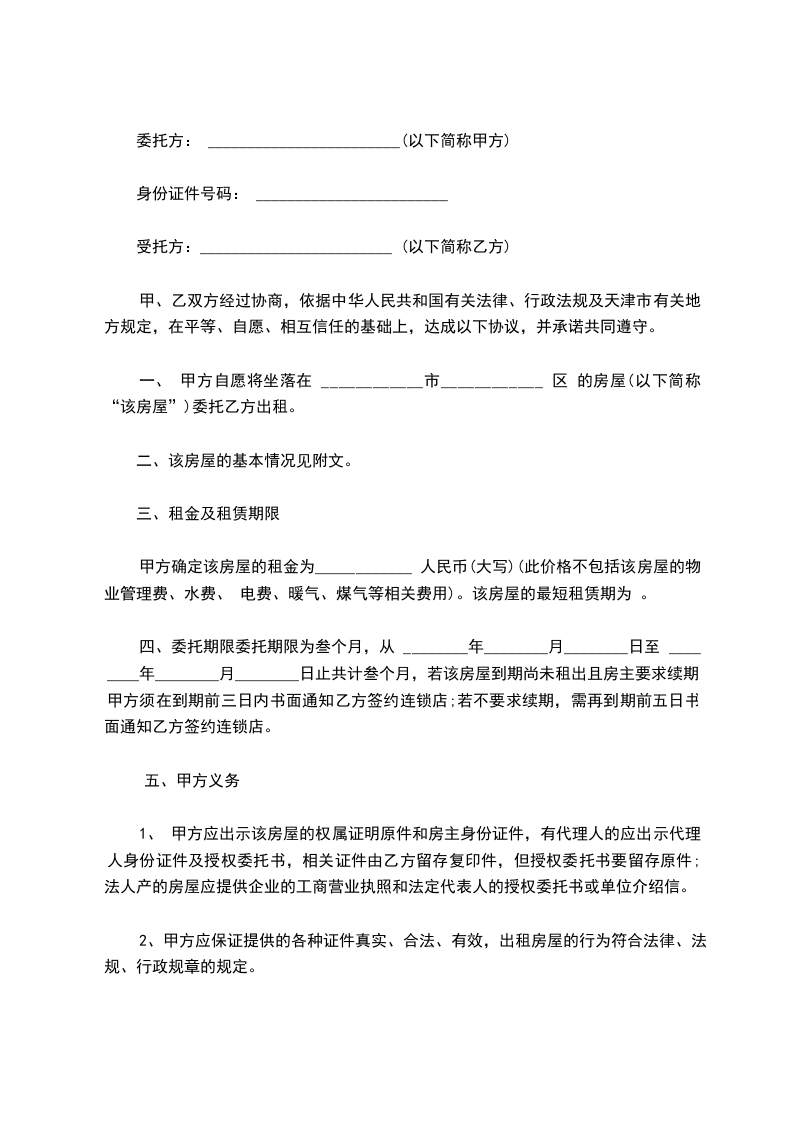 四、委托期限委托期限为叁个月,从 ________年________月________日至 ________年________月________日止共计叁个月,若该房屋到期尚未租出且房主要求续期,甲方须在到期前三日内书面通知乙方签约连锁店;若不要求续期,需再到期前五日书面通知乙方签约连锁店。