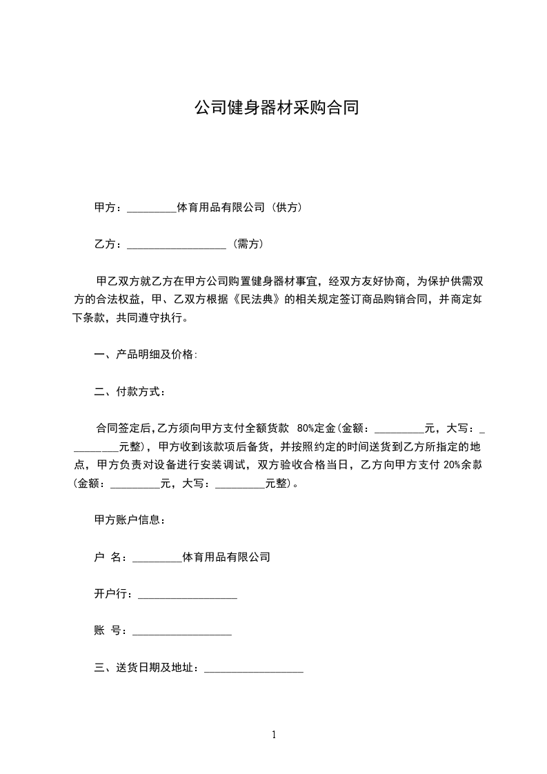 甲乙双方就乙方在甲方公司购置健身器材事宜,经双方友好协商,为保护供需双方的合法权益,甲、乙双方根据《民法典》的相关规定签订商品购销合同,并商定如下条款,共同遵守执行。