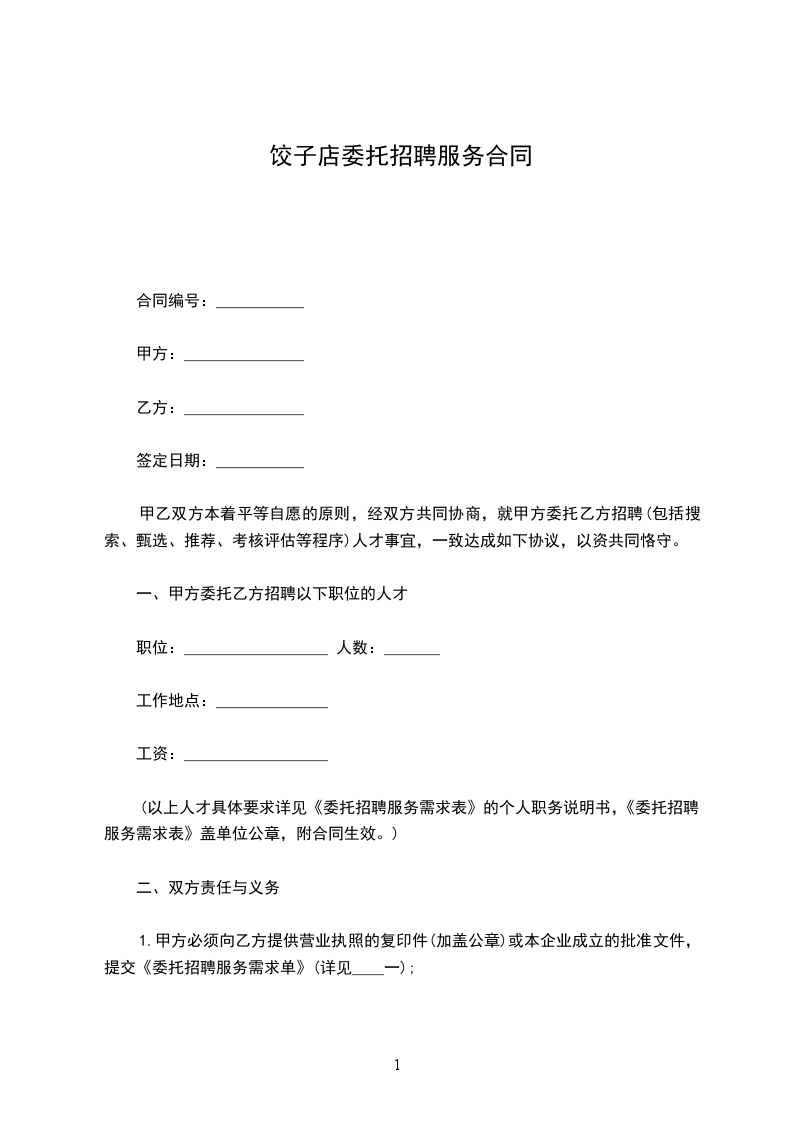 1.甲方同意委托乙方就_________职位(详见《委托招聘服务登记表》)开展委托招聘服务,总服务费为人民币大写___________元。