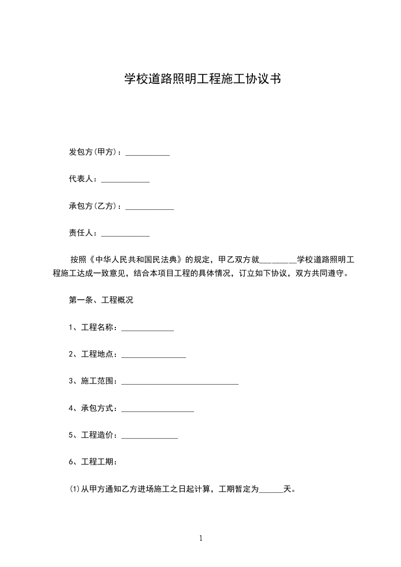 按照《中华人民共和国民法典》的规定,甲乙双方就_________学校道路照明工程施工达成一致意见,结合本项目工程的具体情况,订立如下协议,双方共同遵守。